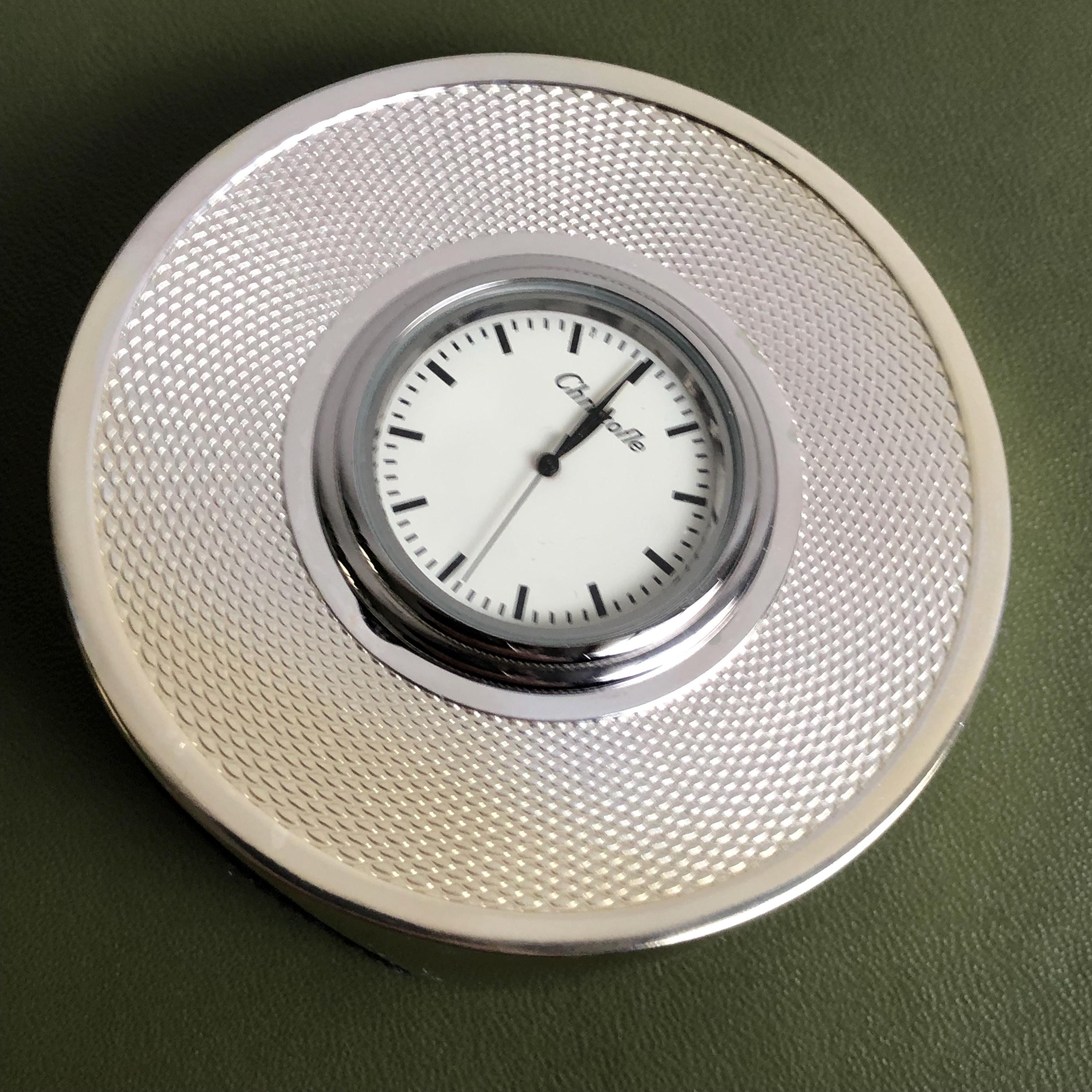 The alarm clock has a silver-plated metal body and is in perfect working order, as shown in the video. In good condition, it comes with its original box and warranty.