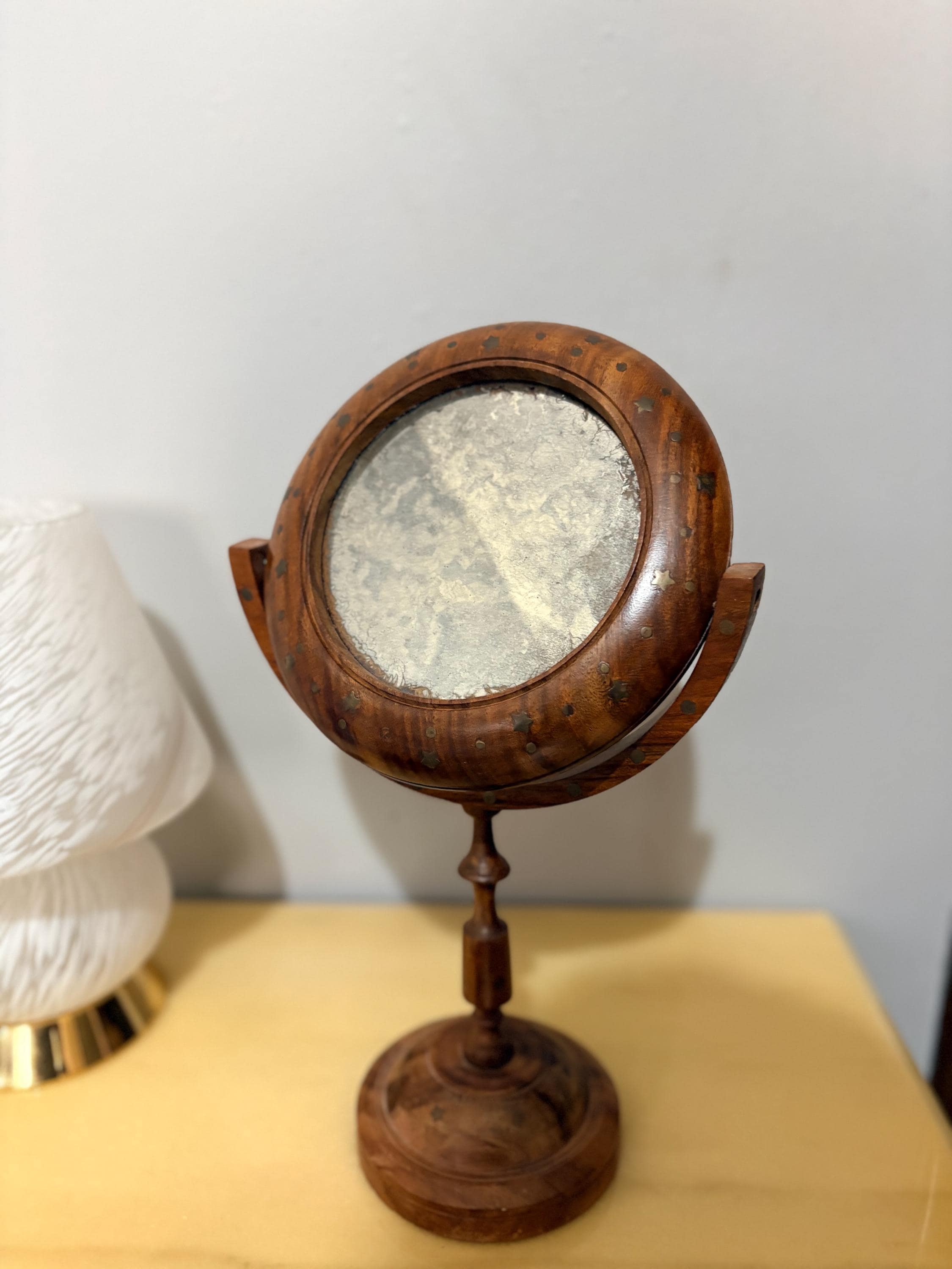 Handcrafted in wood. Tilting mirror with mercury glass. Decorations on the frame.