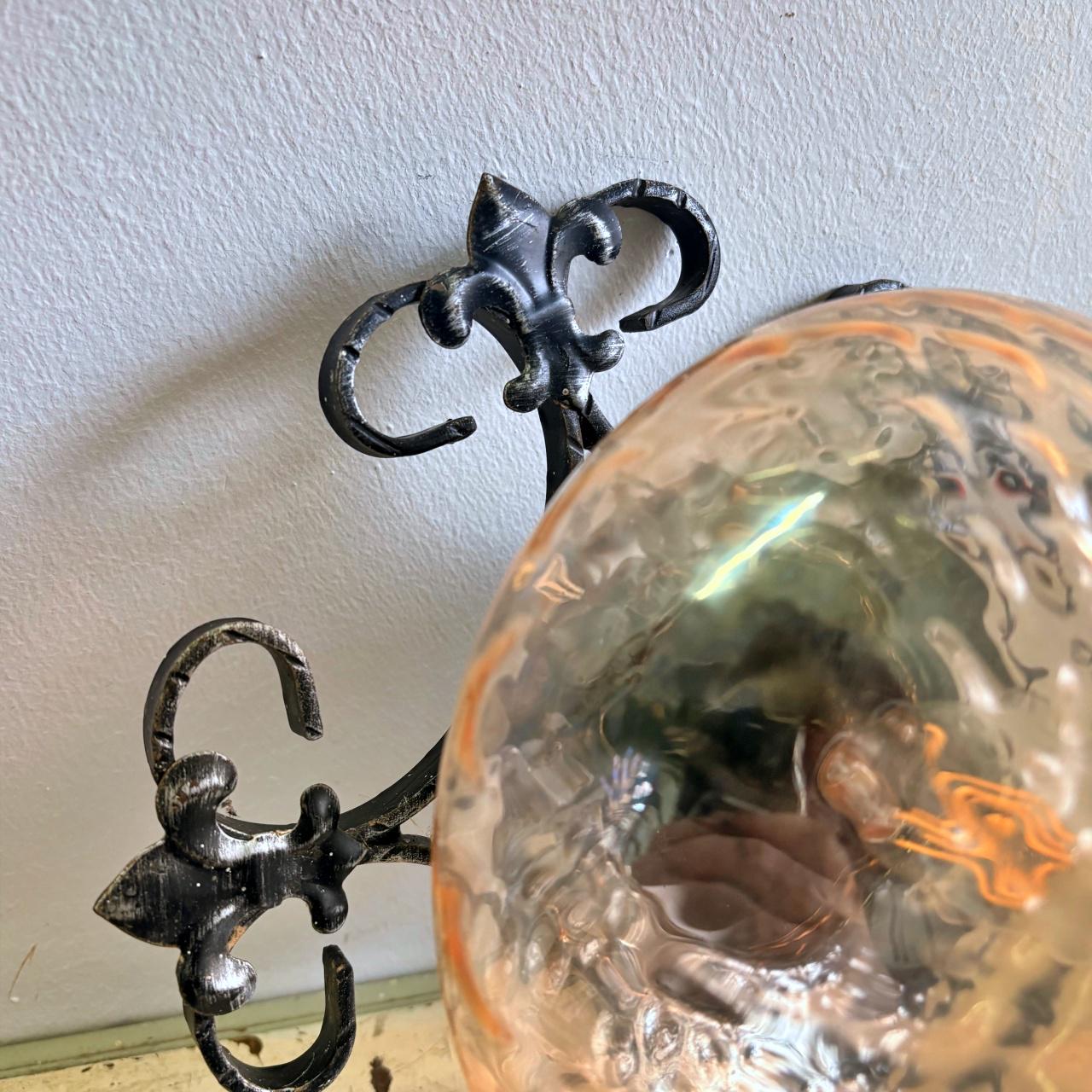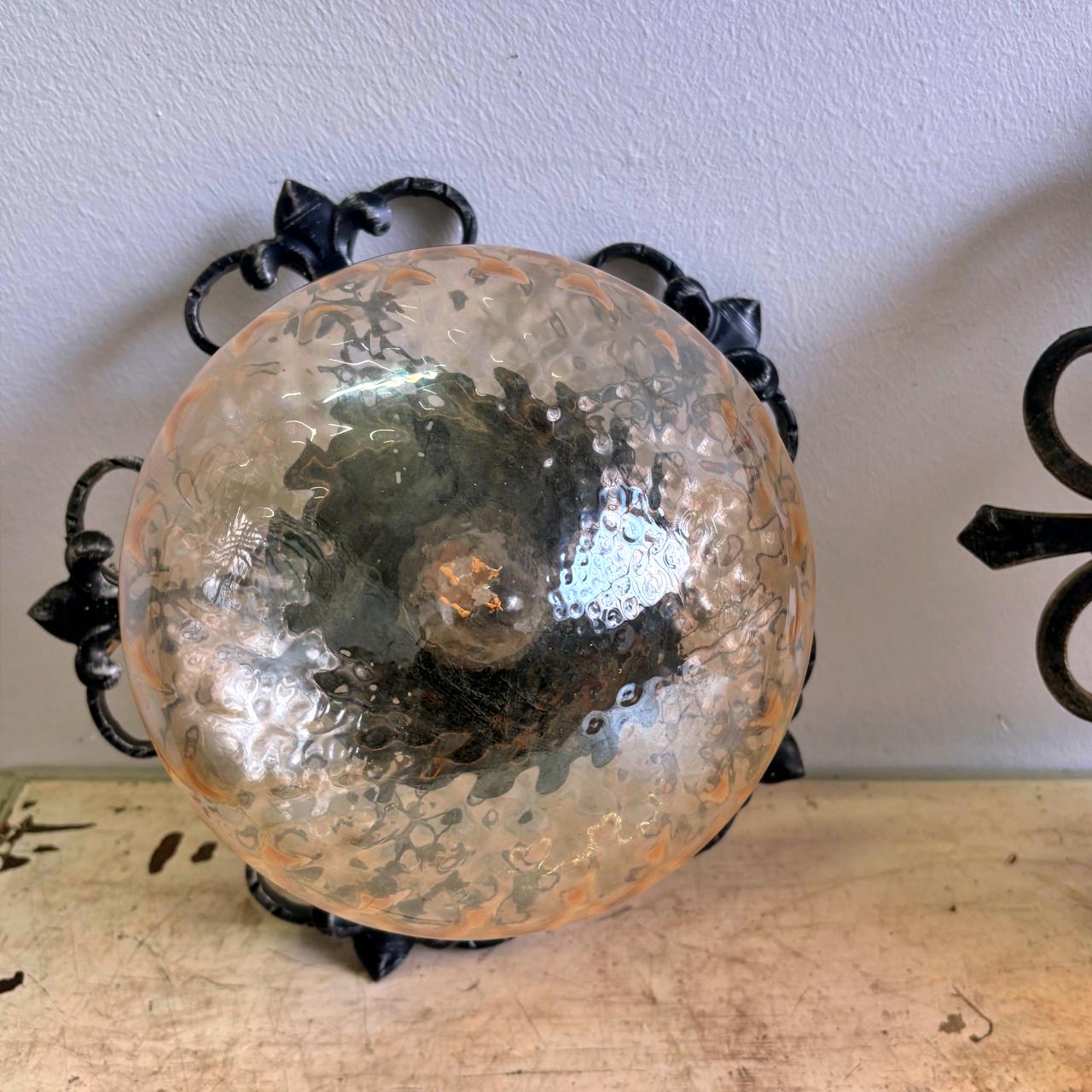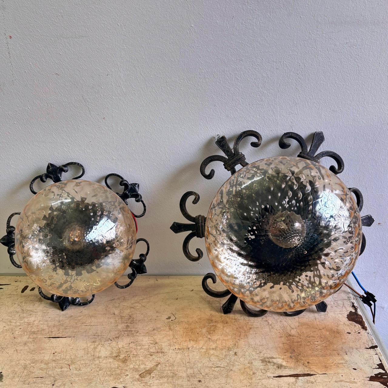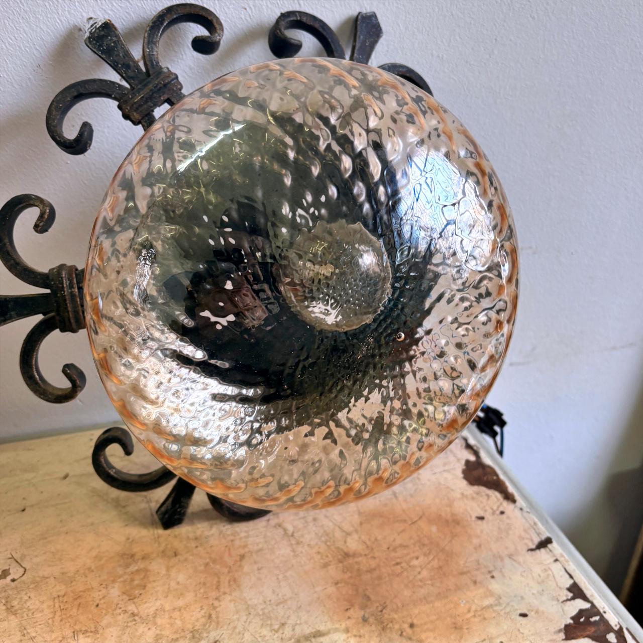 Pair in wrought iron with blown glass sphere and square pattern, yellow in color. In good condition, with minimal signs of wear.