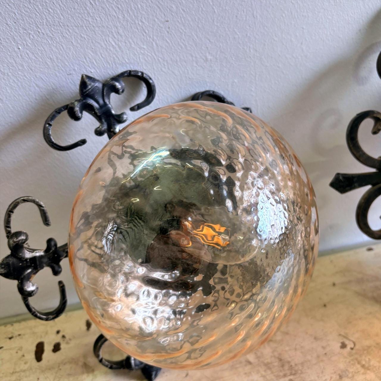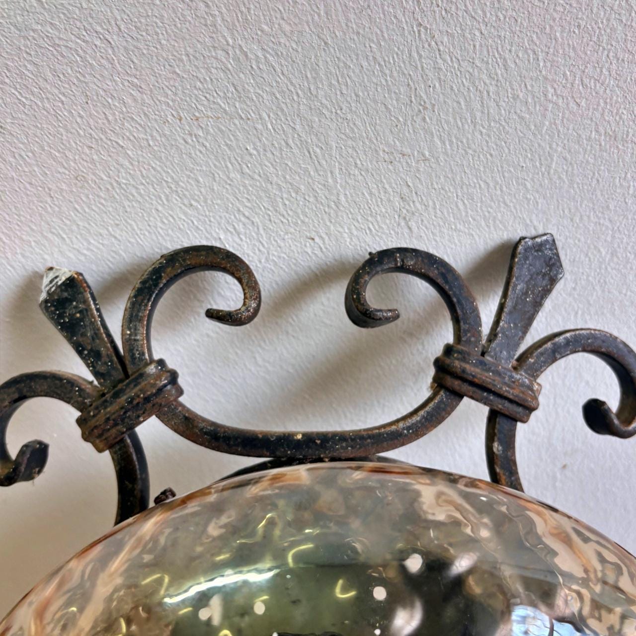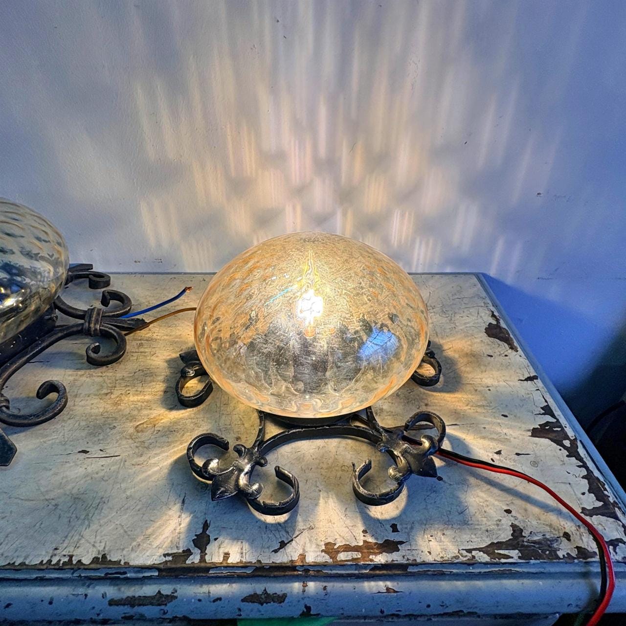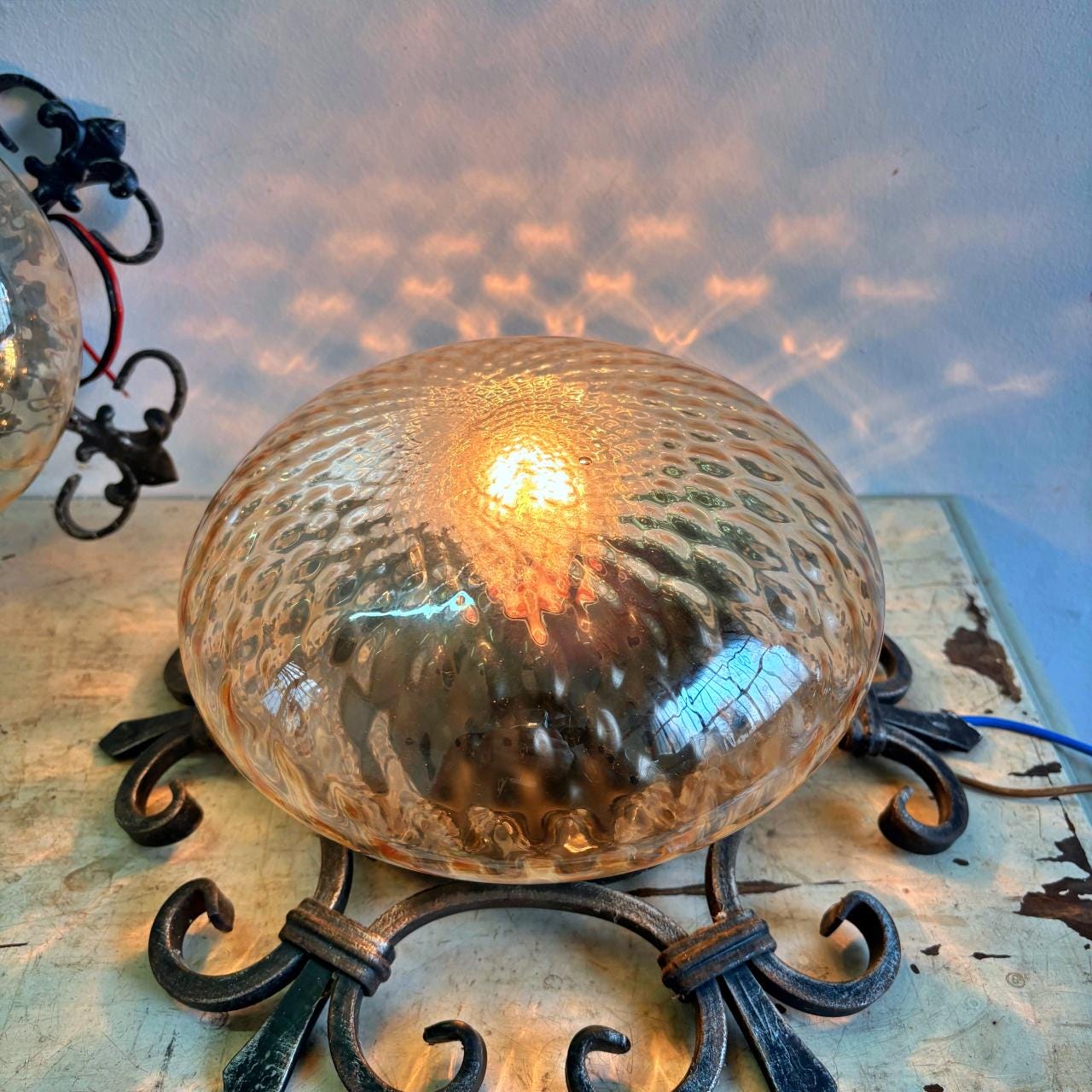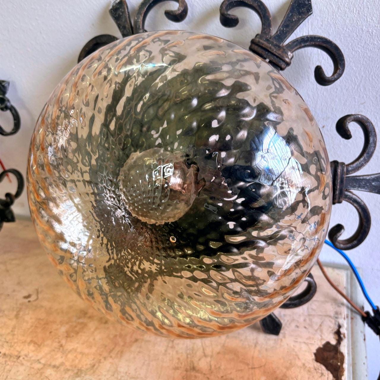 Pair in wrought iron with blown glass sphere and square pattern, yellow in color. In good condition, with minimal signs of wear.