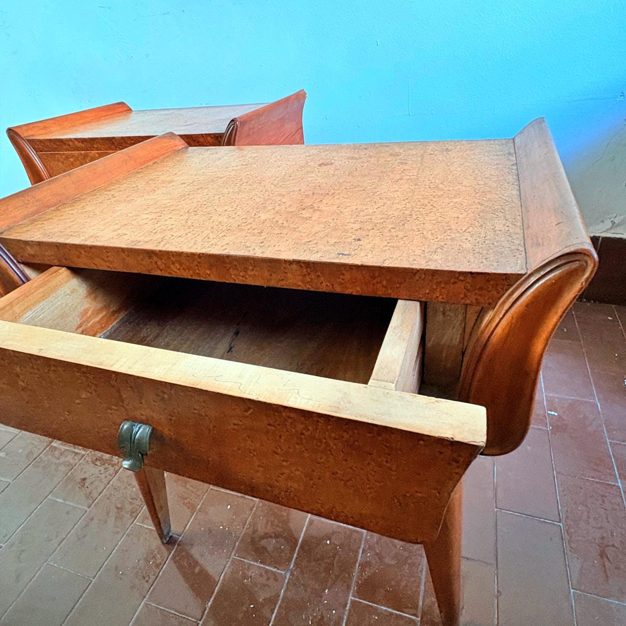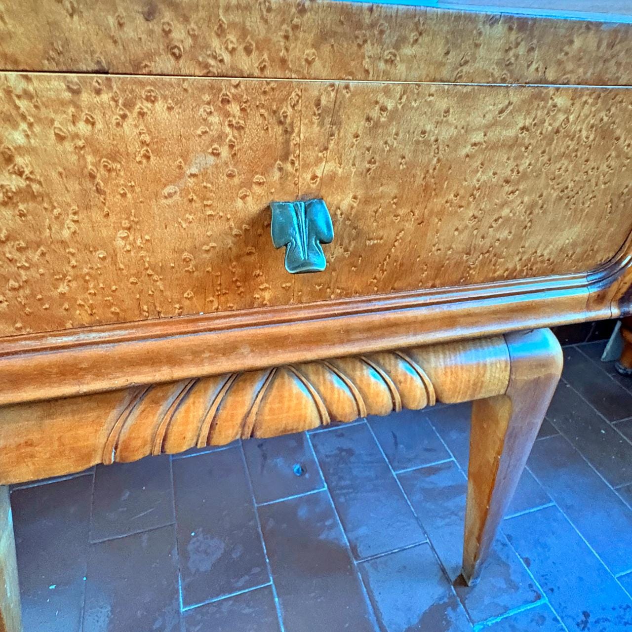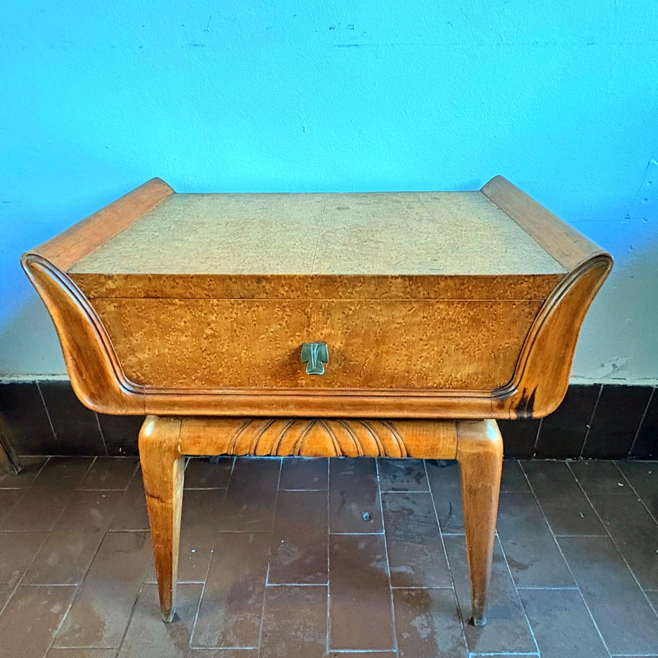 Wooden bedside tables in mid-century modern style, typical of the Art Deco period. Both pieces feature a brass handle and a drawer. The lower part is engraved, while the sides and legs are inspired by Scandinavian/Swedish design.