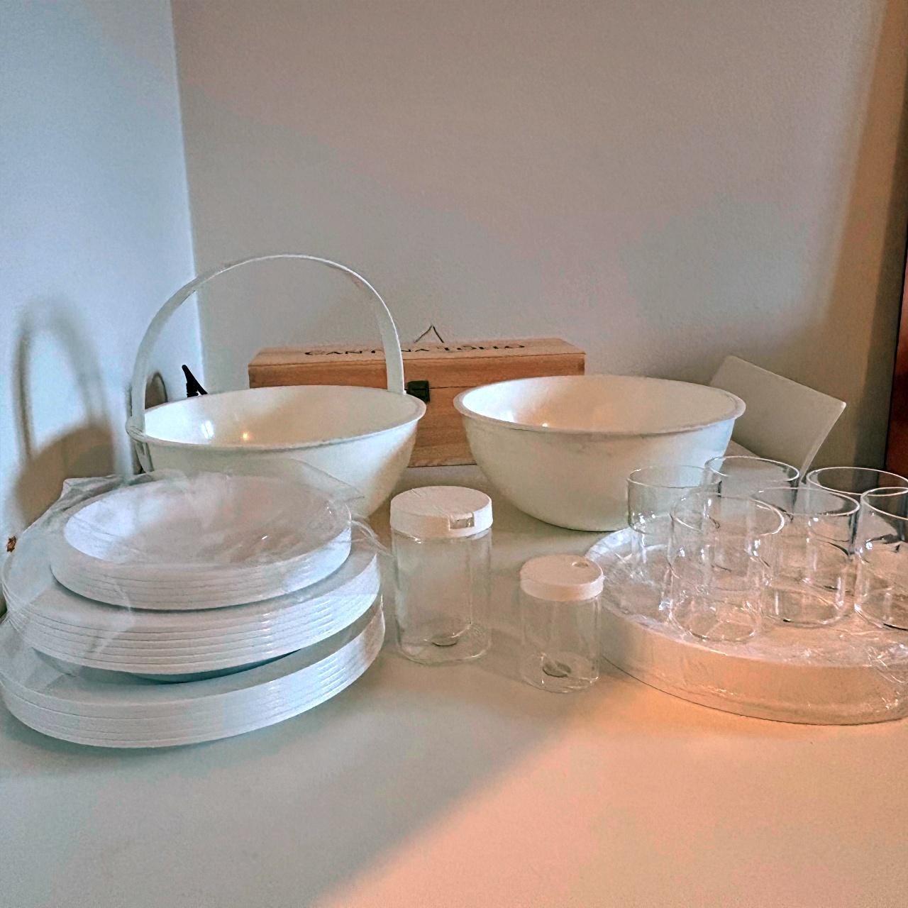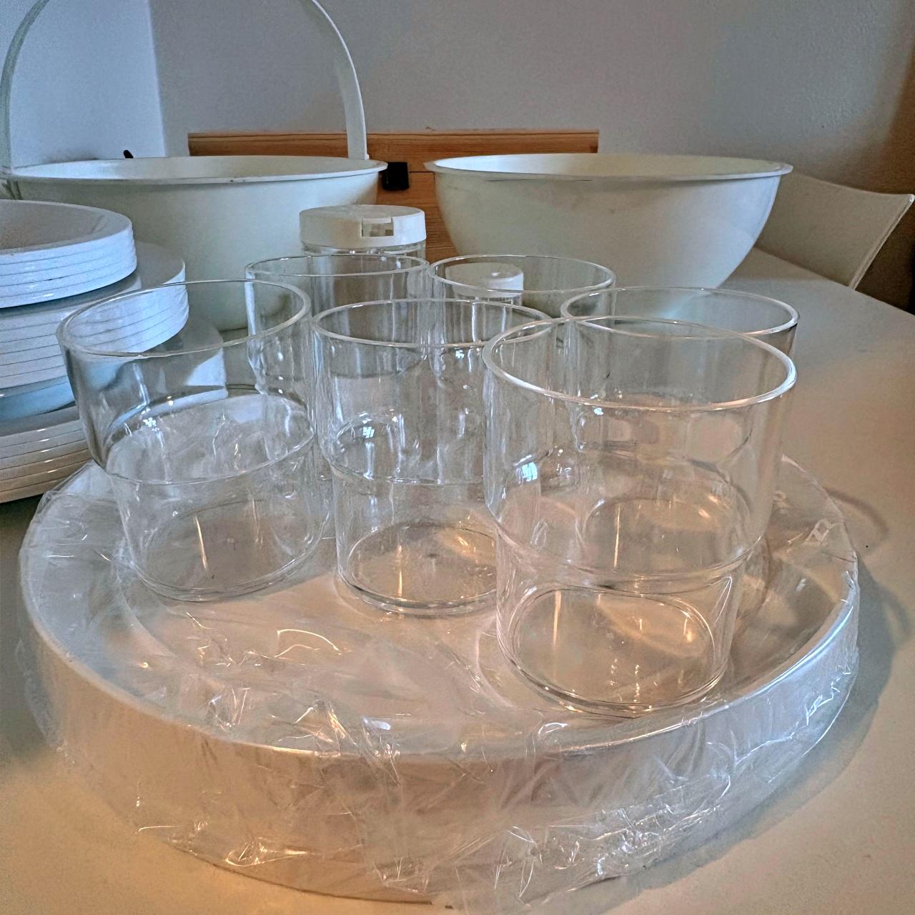 The set includes six soup plates, six dinner plates, and six dessert plates, as well as six glasses, a vinegar container, and a spice holder (salt and pepper), along with an elegant tray. The two hemispheres that enclose the items become a fruit bowl and a salad bowl respectively.