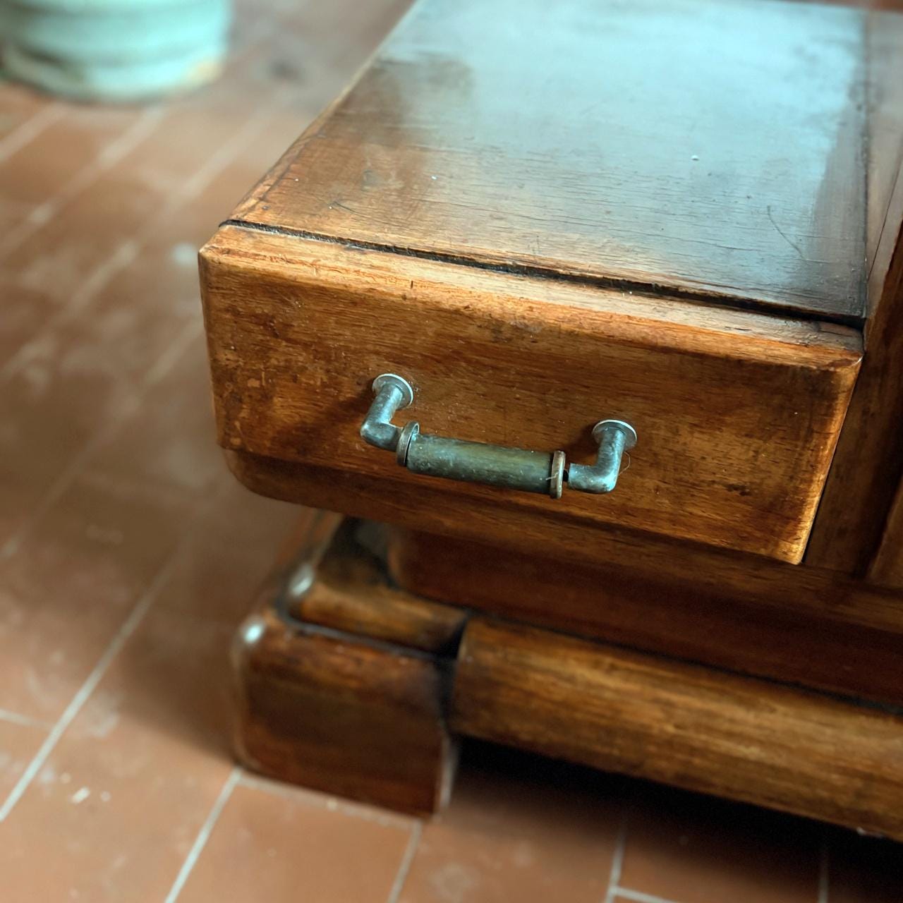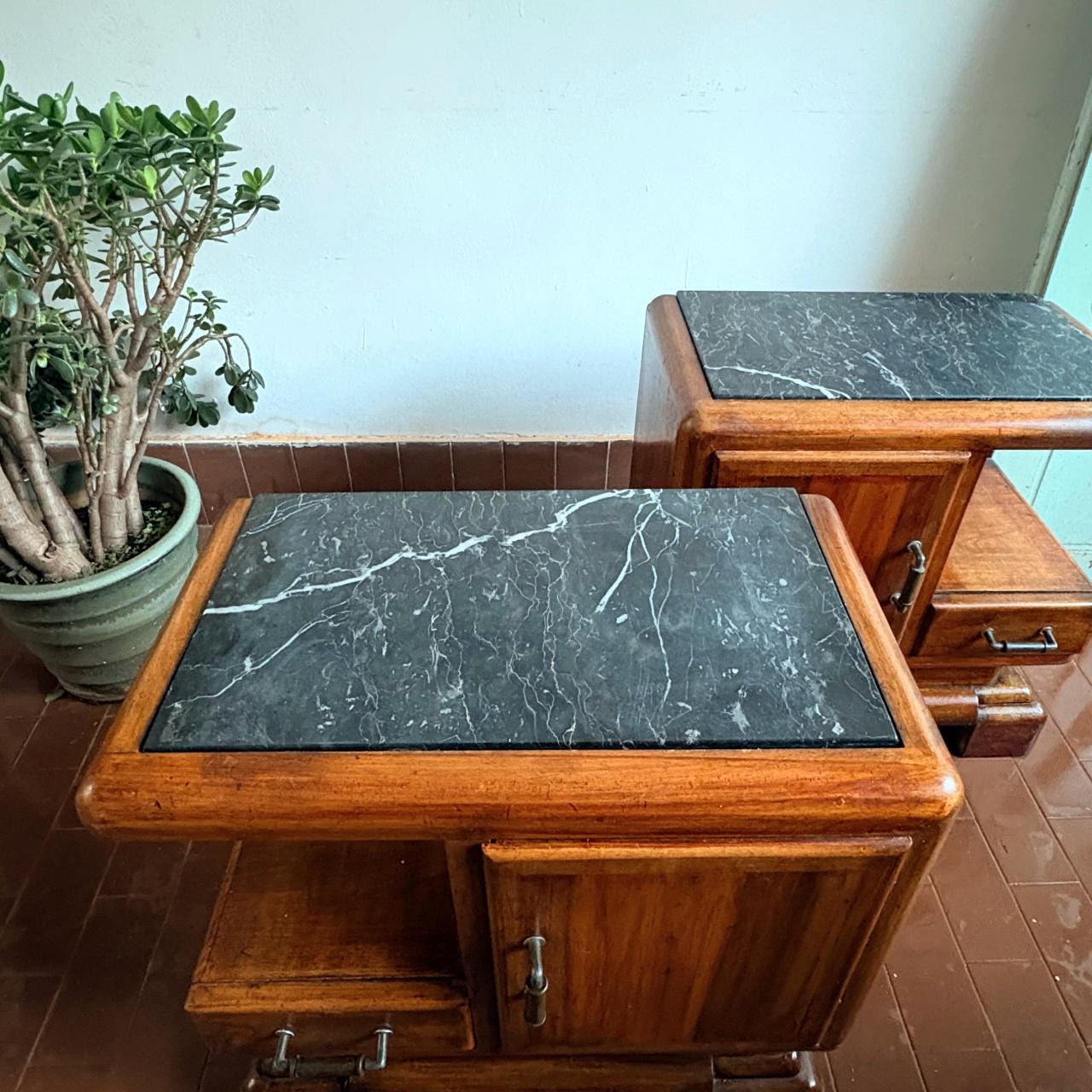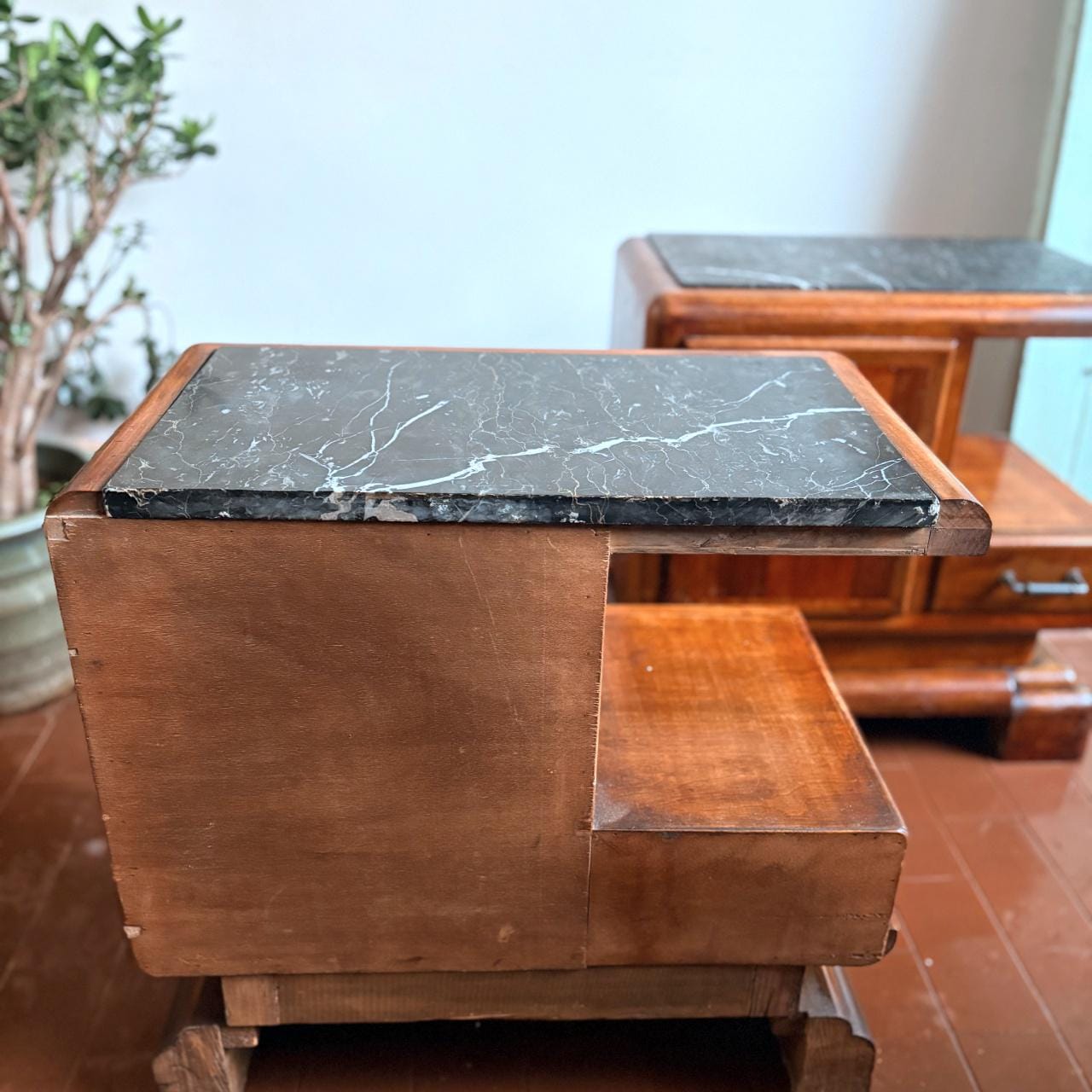 Pair of Art Deco style bedside tables, Italian craftsmanship from the 1950s, wooden body with marble top.