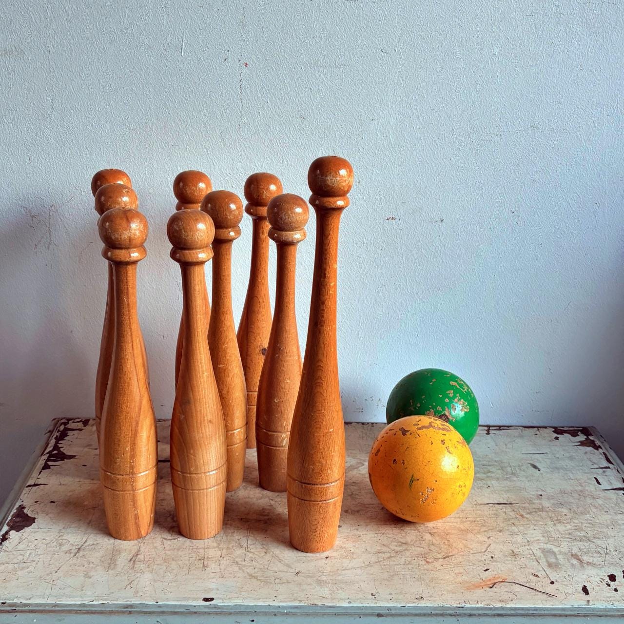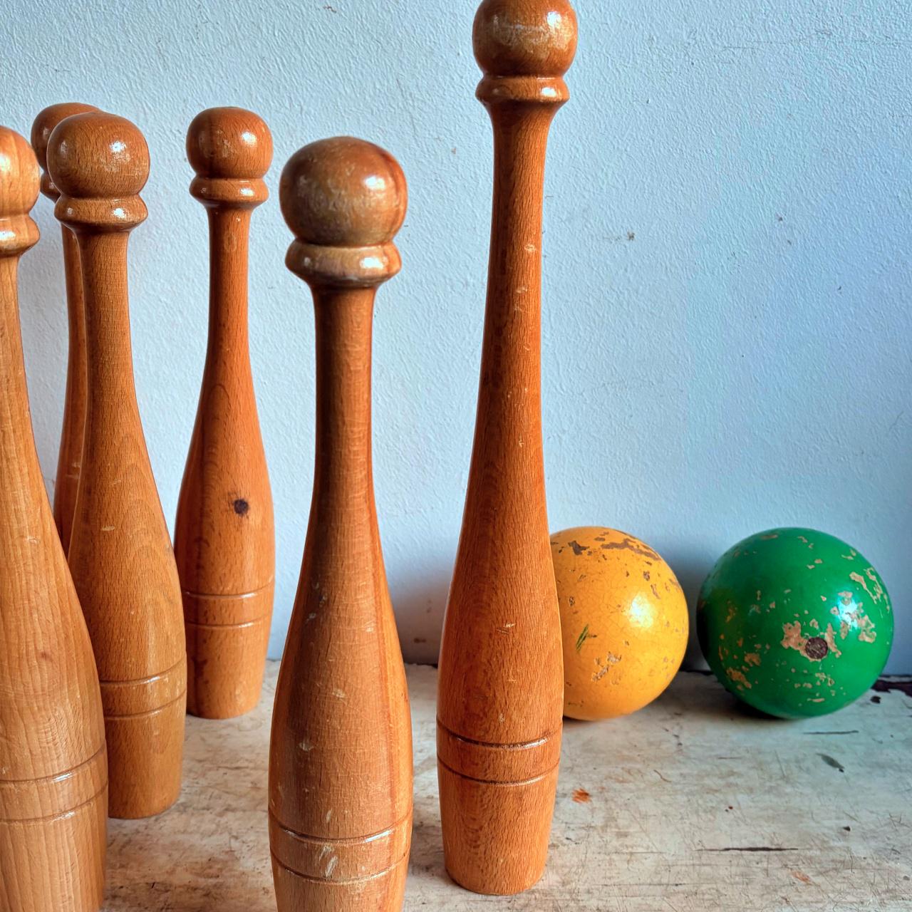 The set is in good condition, with minor signs of age and wear on the pins. The green and yellow balls have some paint loss.