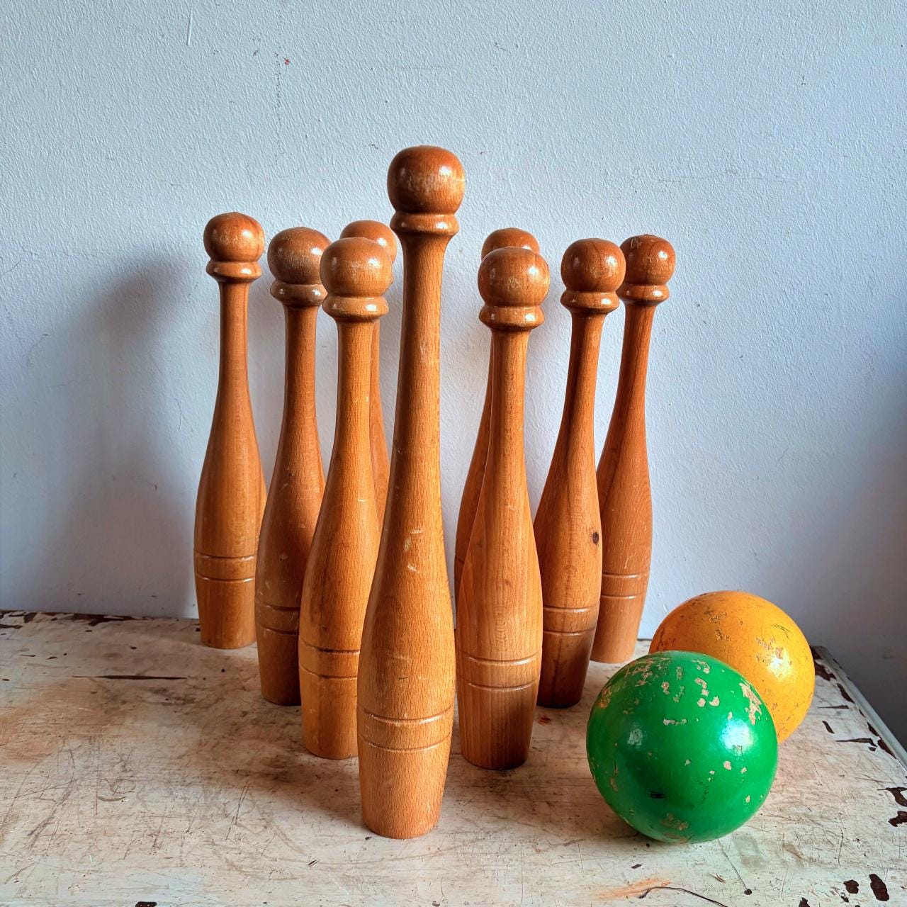 Unique bowling set for the garden, consisting of 9 pins and two softwood balls.