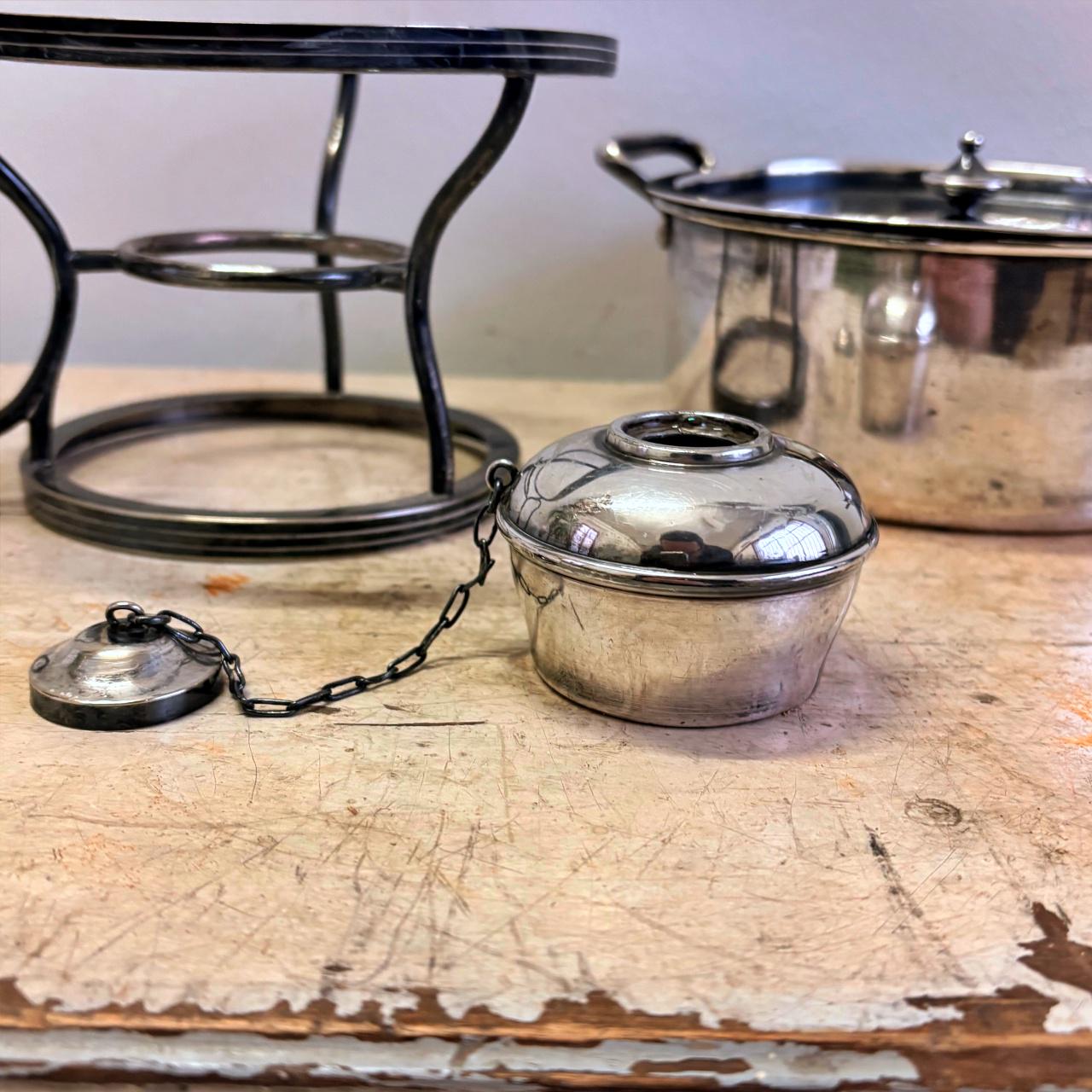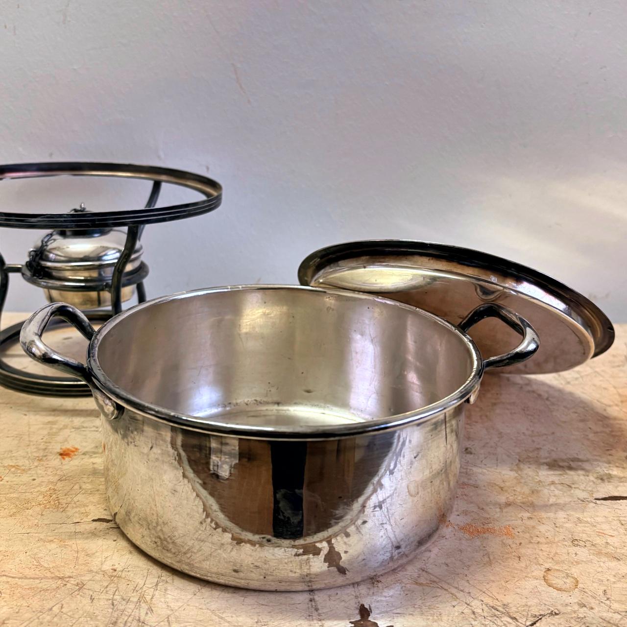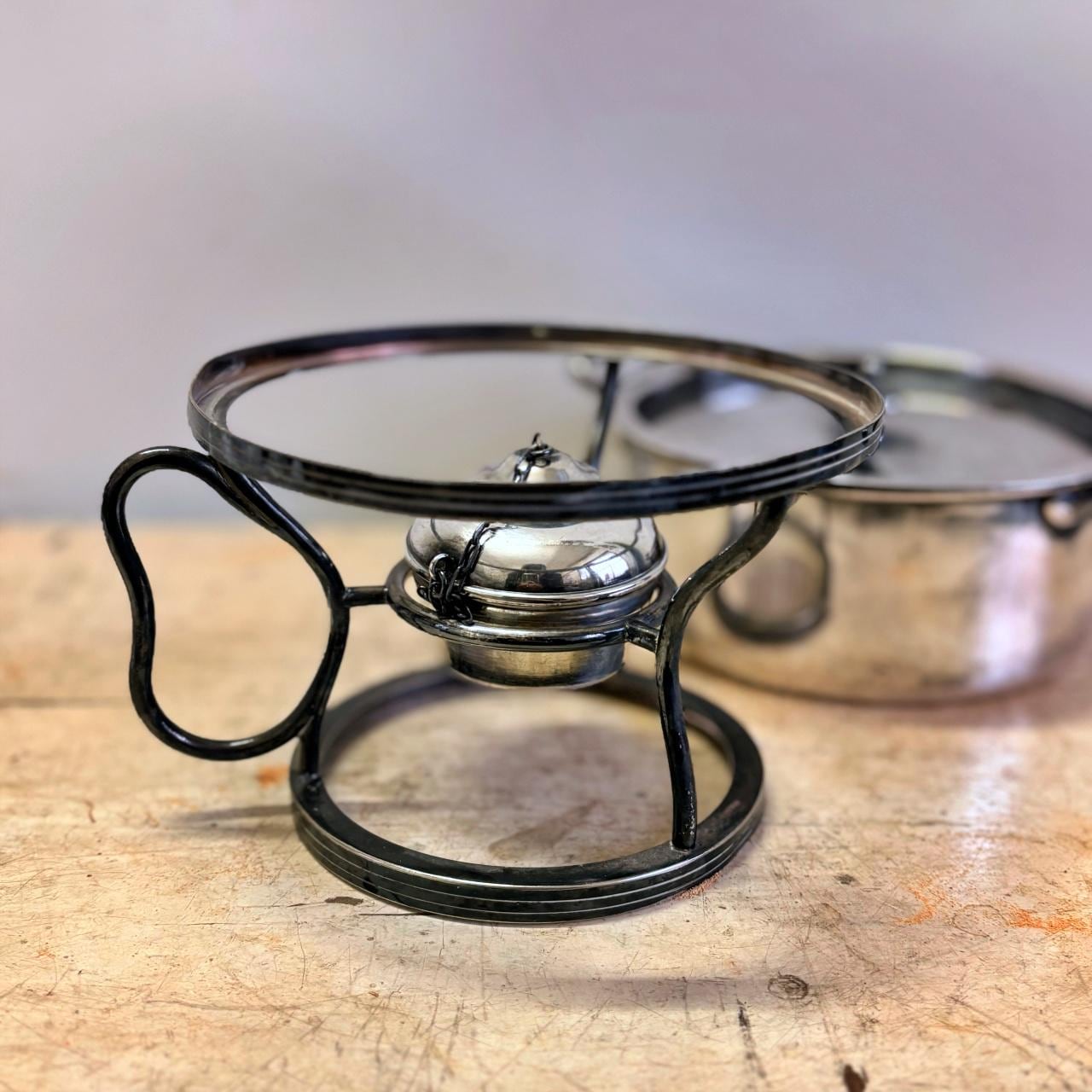 The set is complete, with a small pot for storing food, its stand, and the flame holder. Although it has been used, the set is in good condition, with some signs of wear.