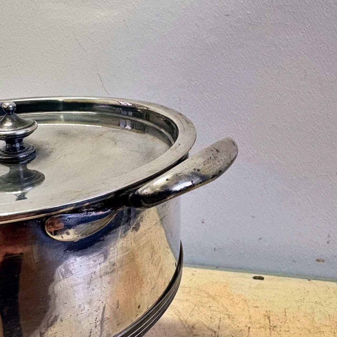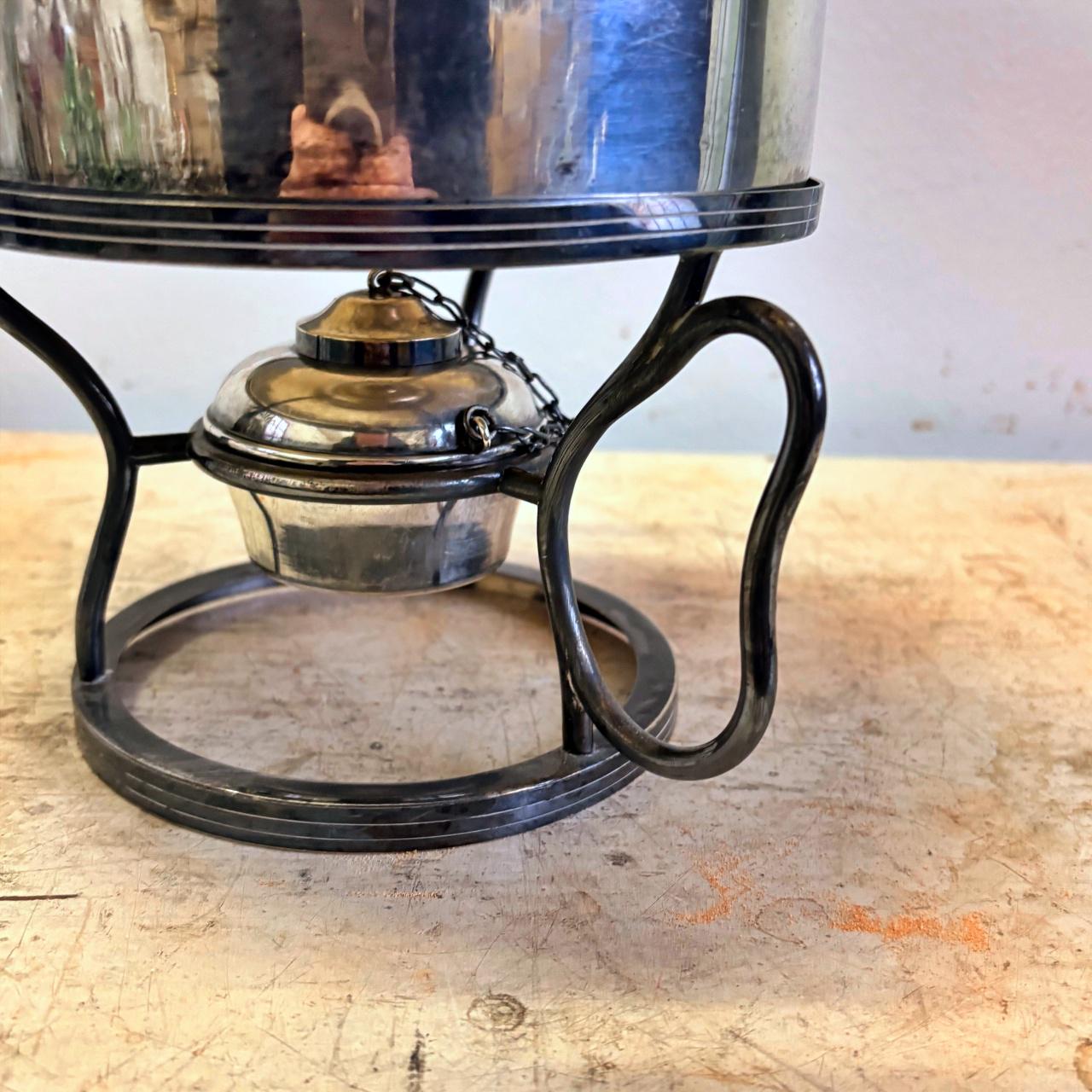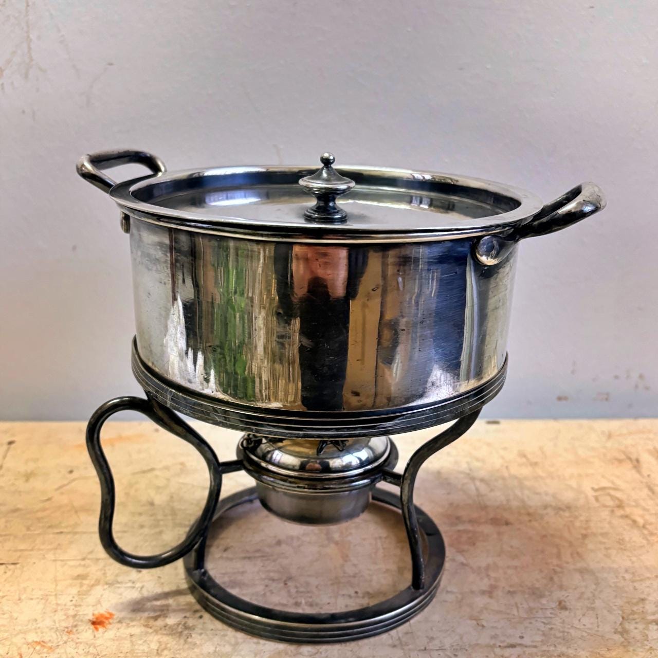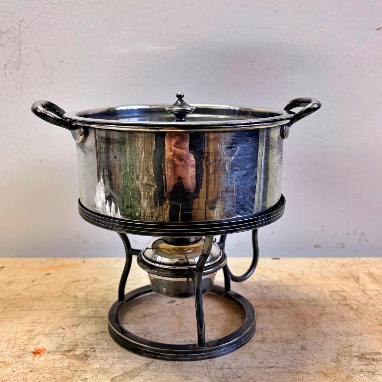 The set is complete, with a small pot for storing food, its stand, and the flame holder. Although it has been used, the set is in good condition, with some signs of wear.