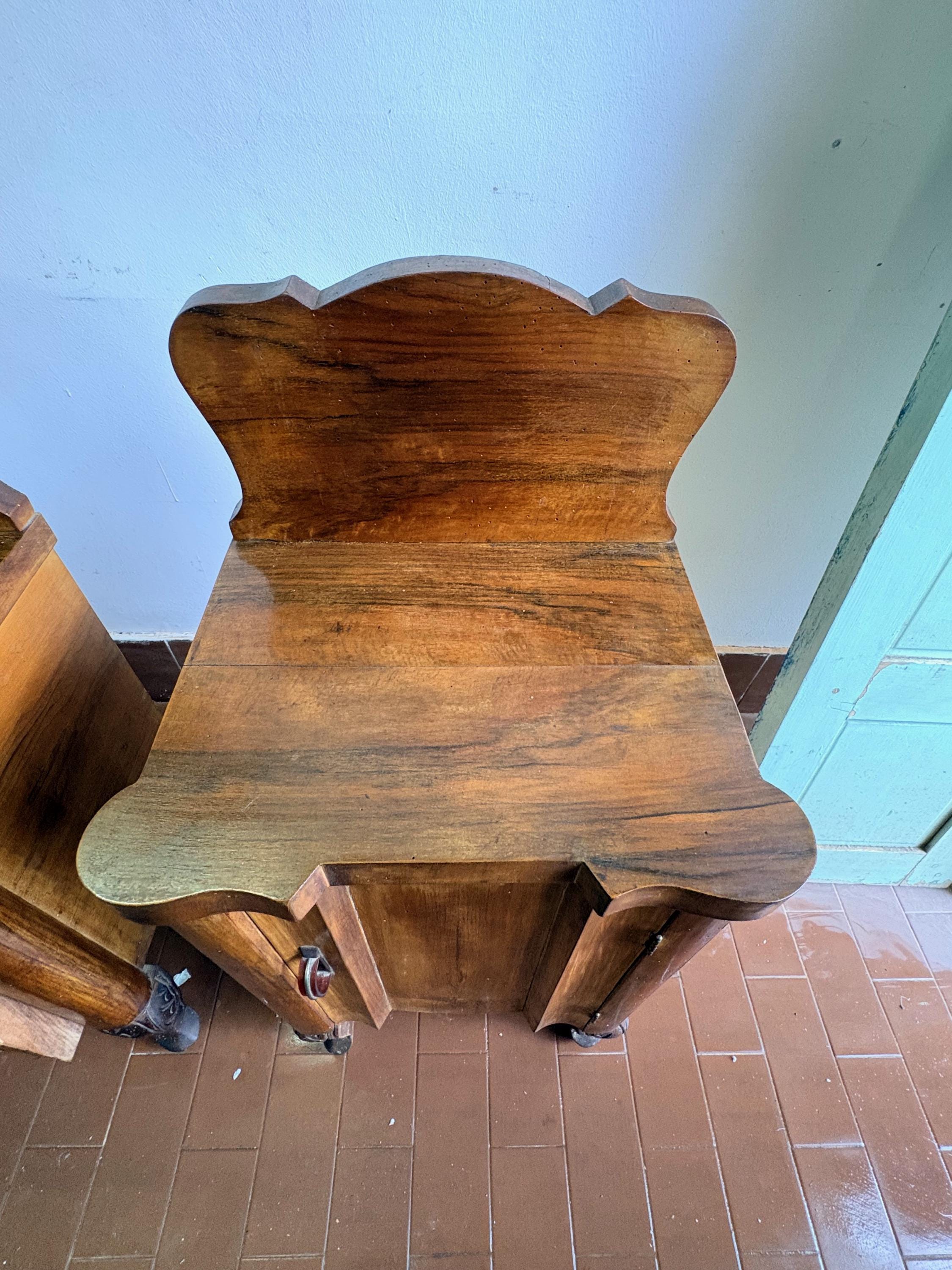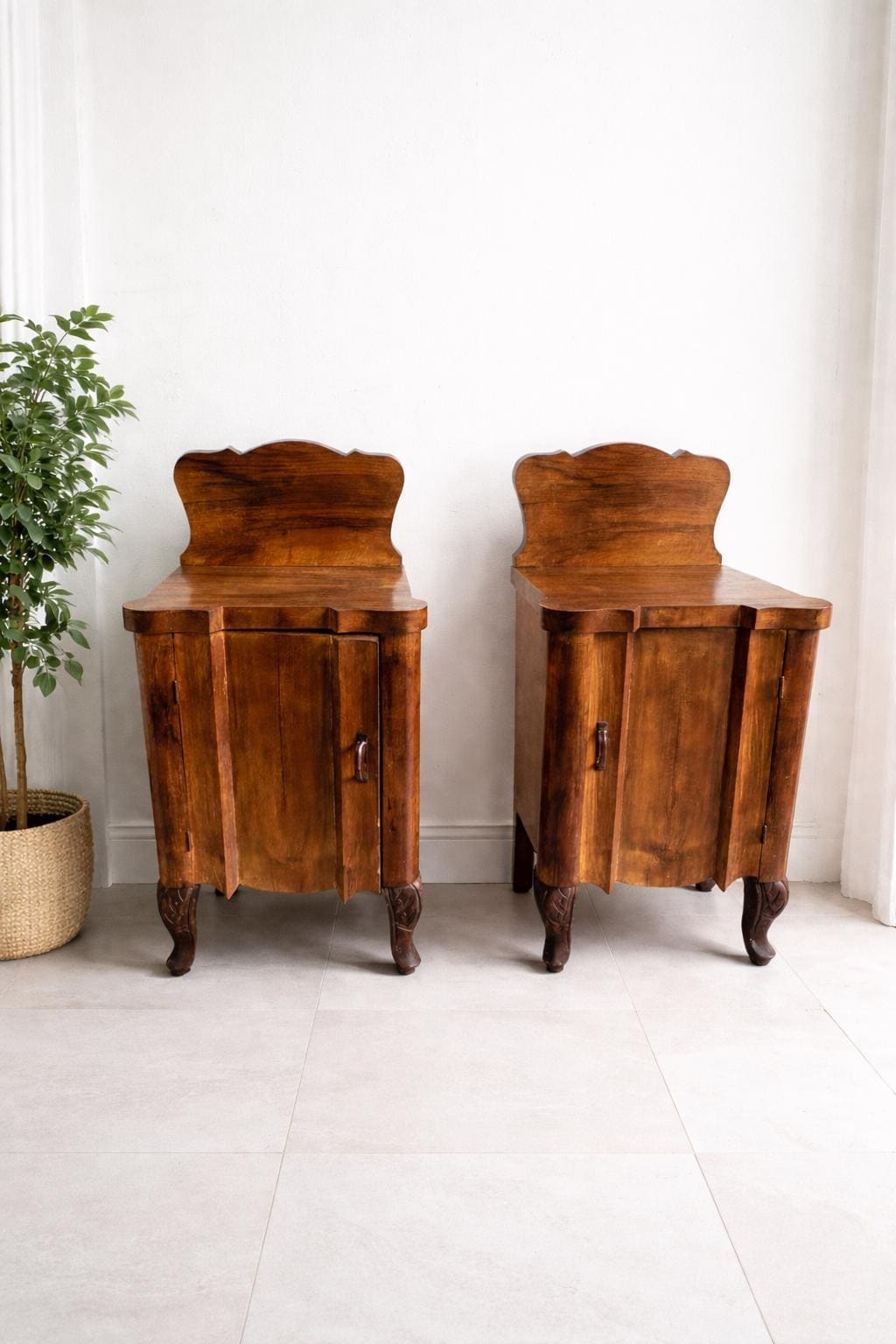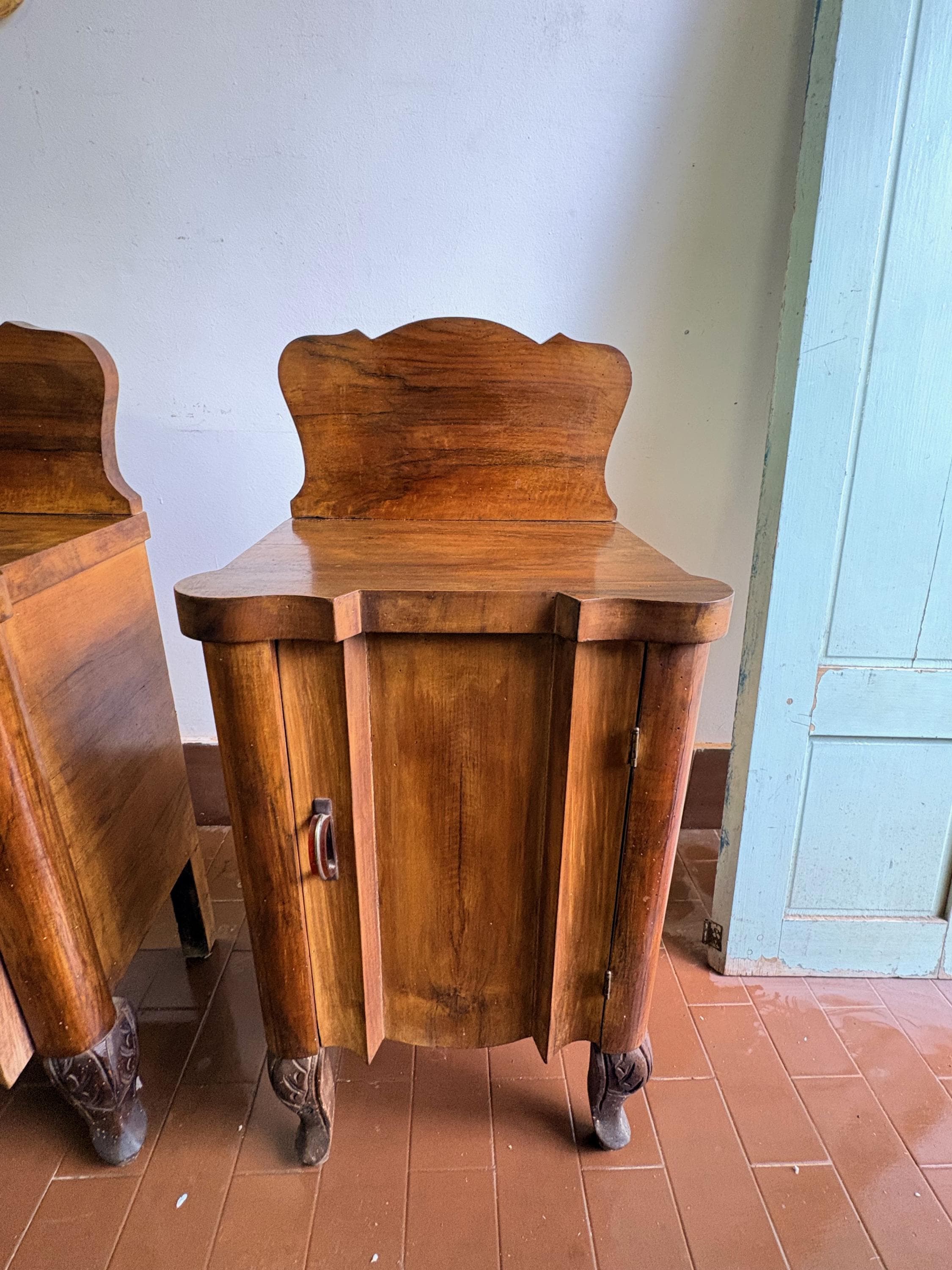 The body of the bedside tables is made of wood. The top has a smooth finish, typical of the period. On the sides there is a small raised panel with engraved detailing (which can be easily removed). In the center there is a large door with a spacious shelf and a brass handle.