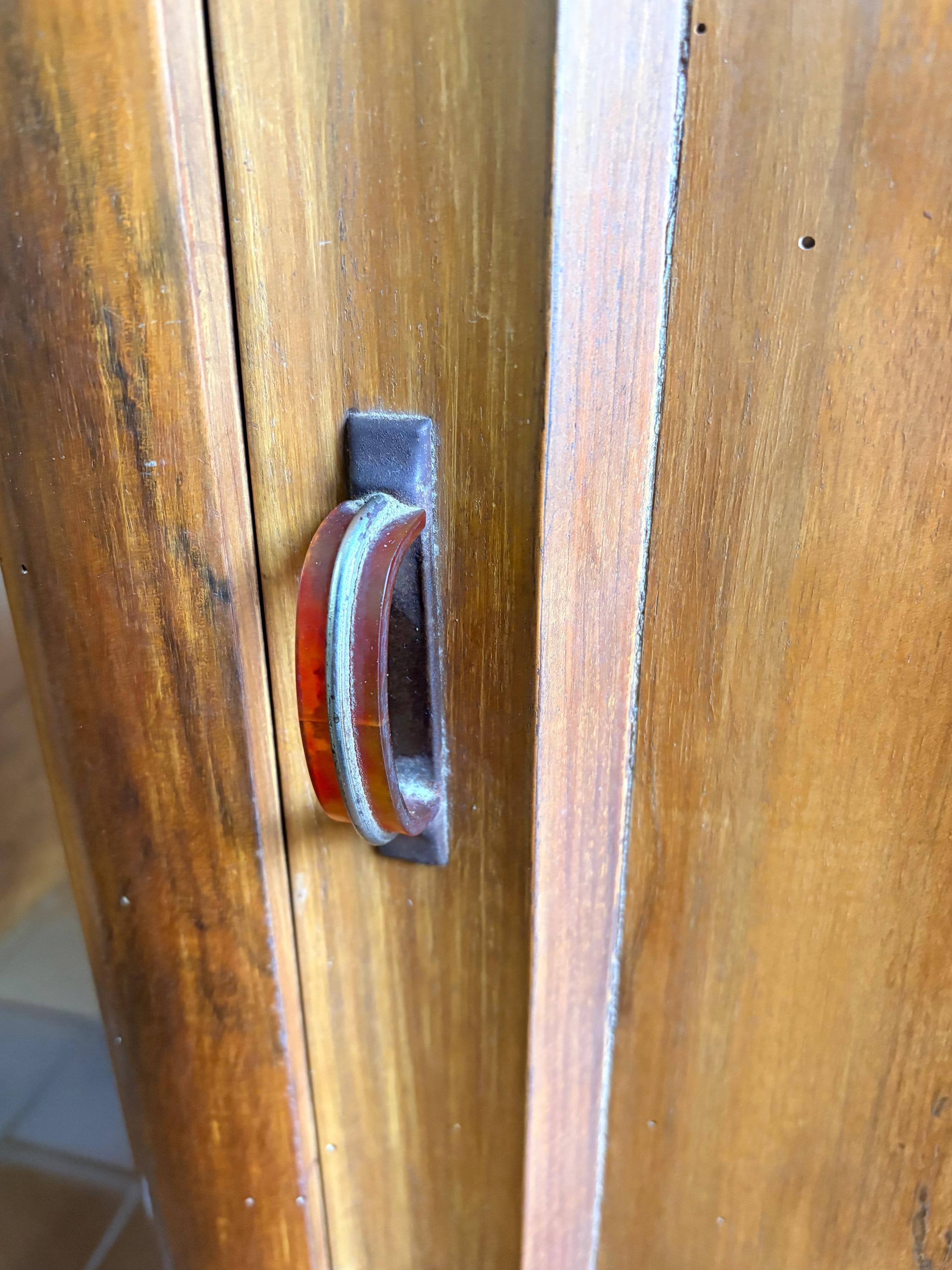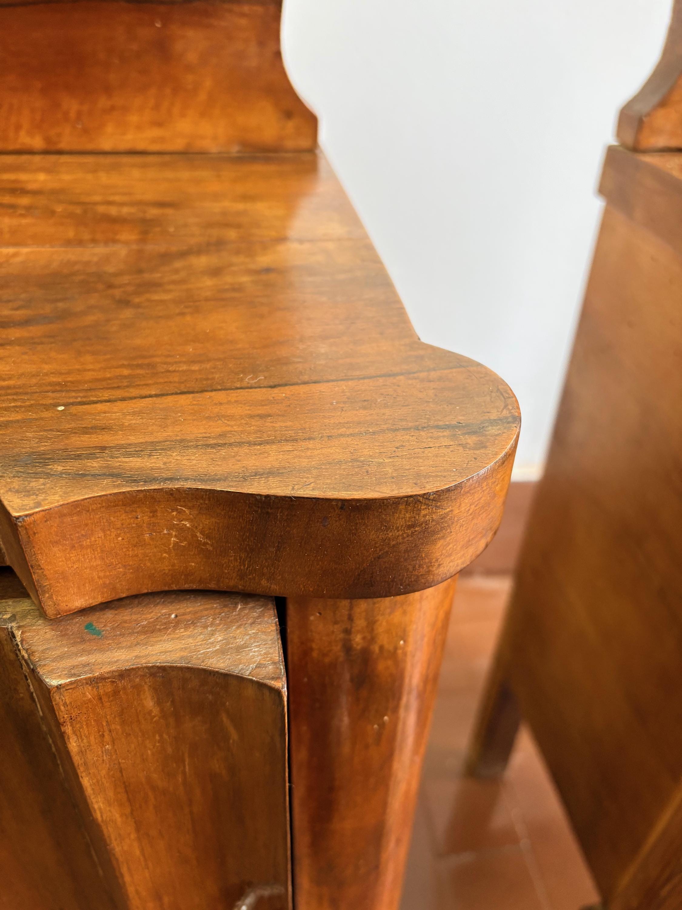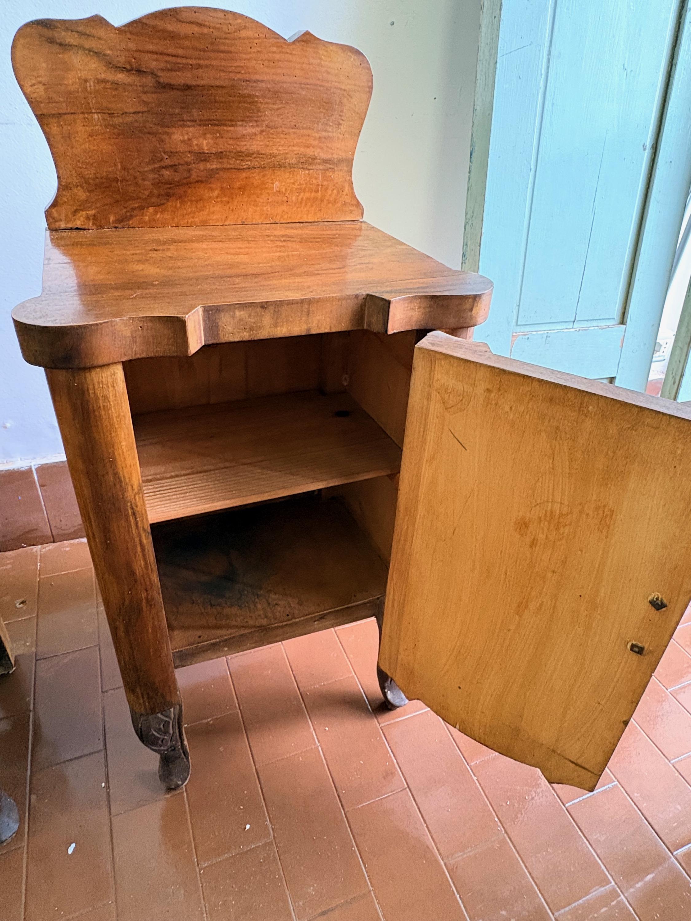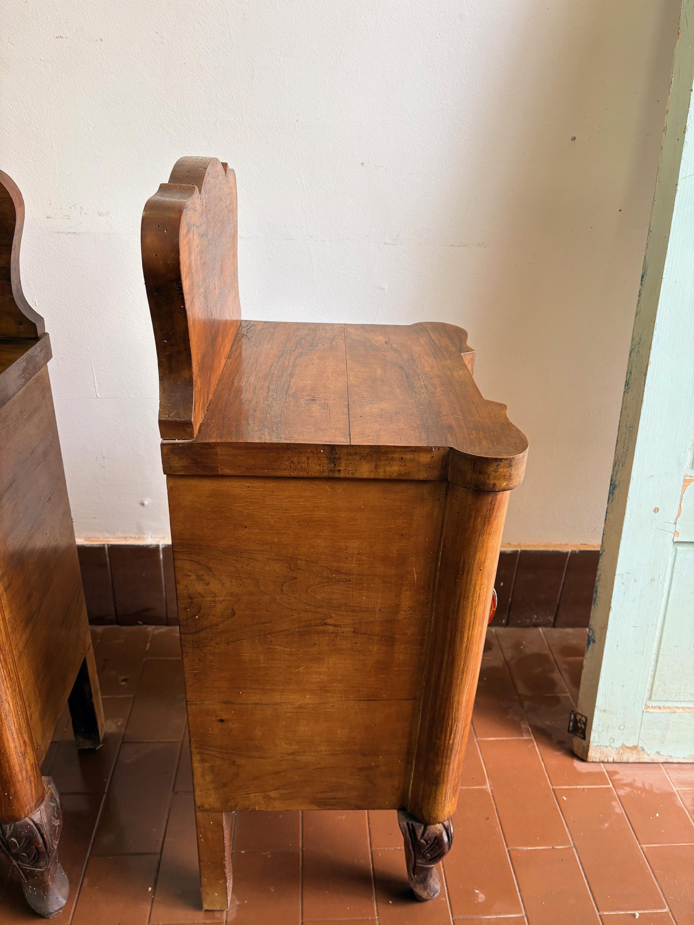 The body of the bedside tables is made of wood. The top has a smooth finish, typical of the period. On the sides there is a small raised panel with engraved detailing (which can be easily removed). In the center there is a large door with a spacious shelf and a brass handle.