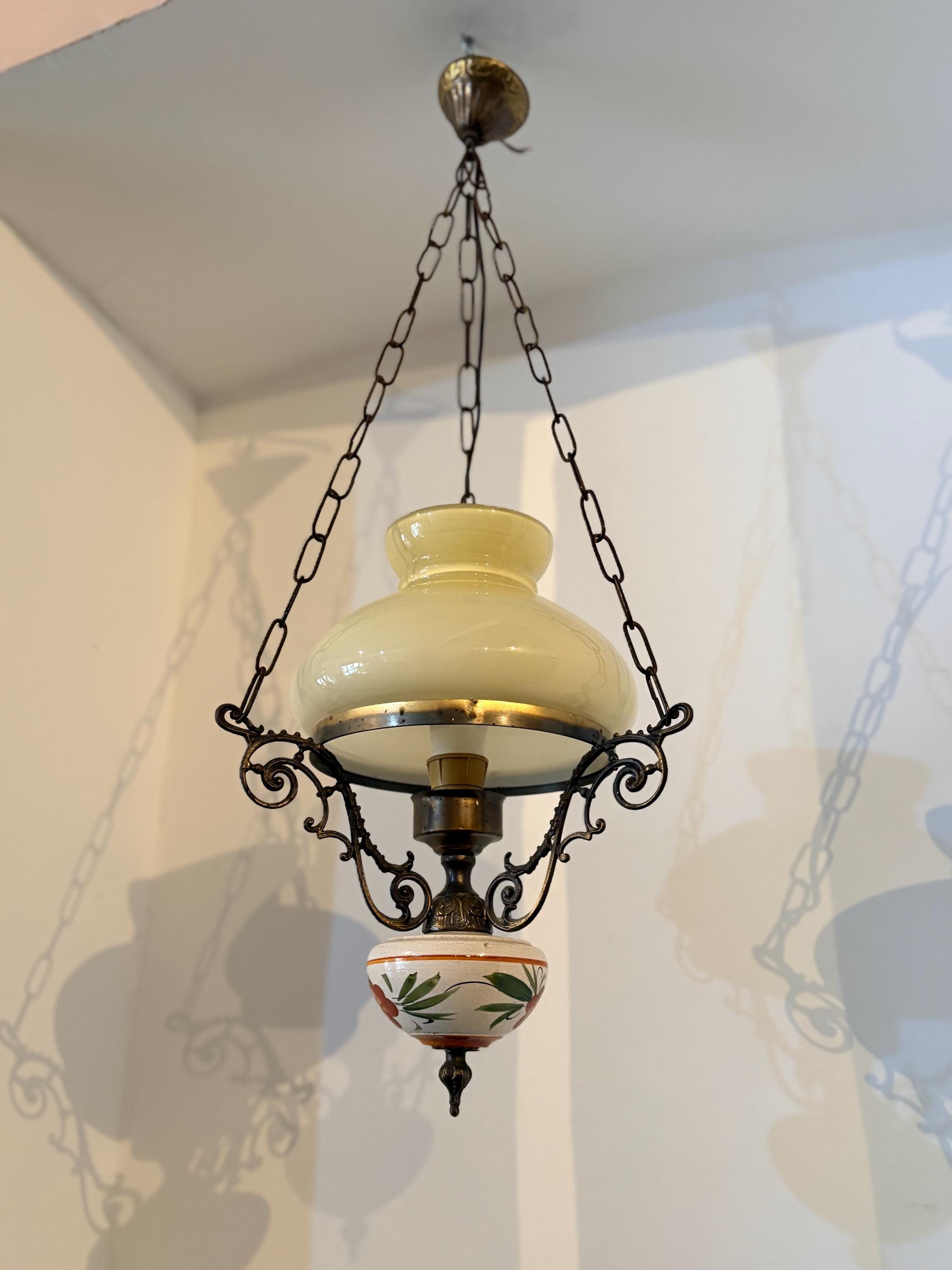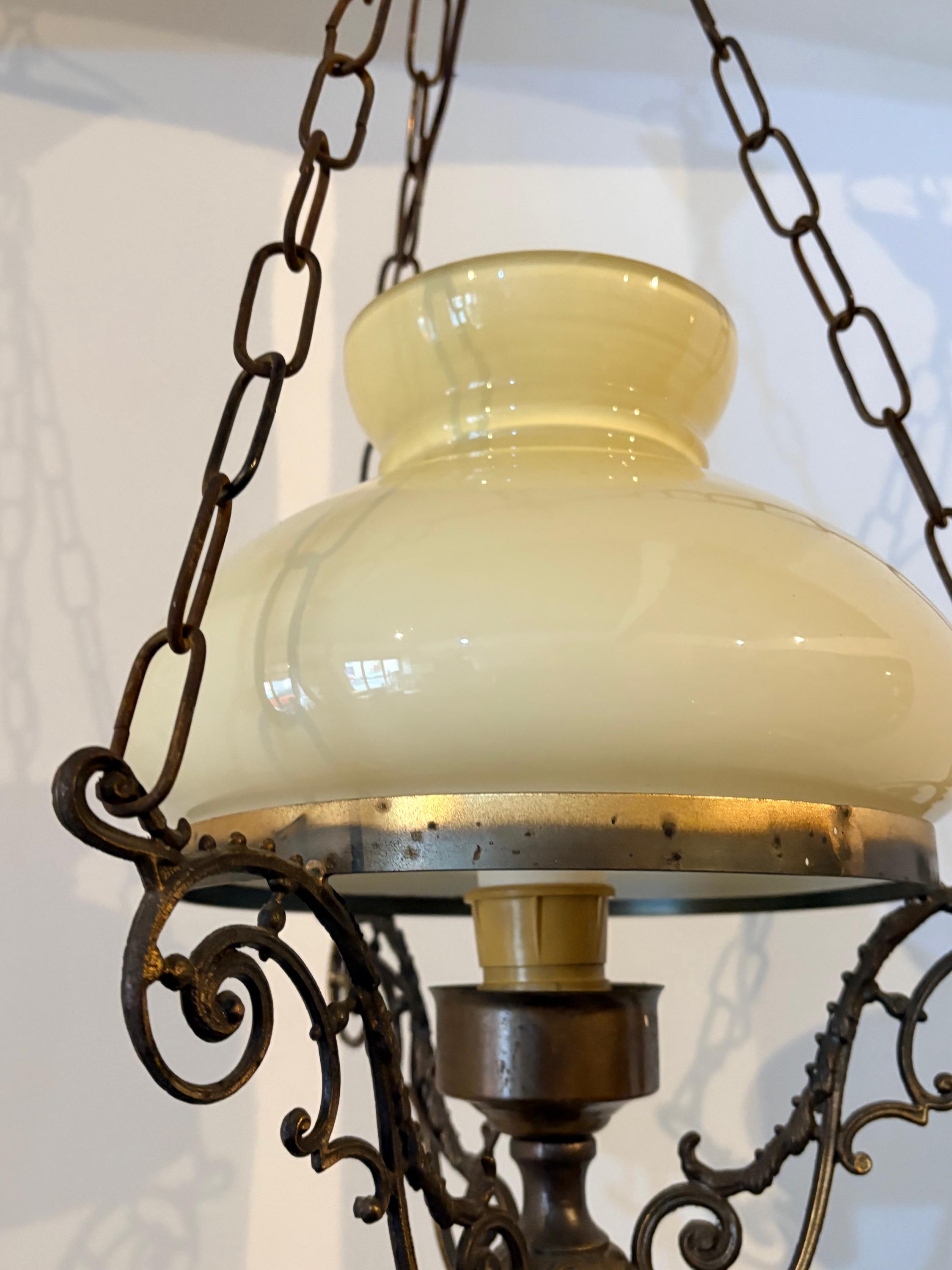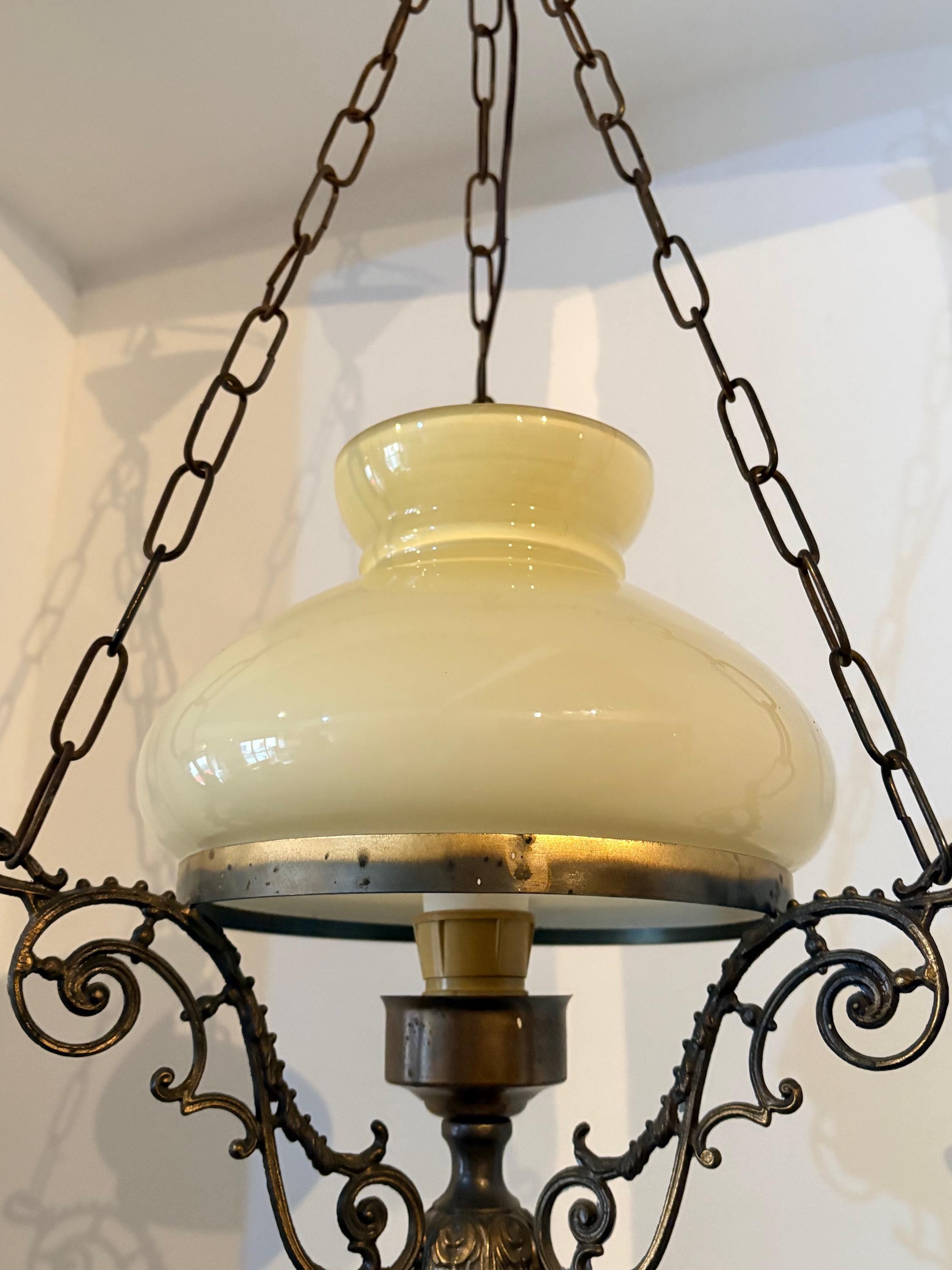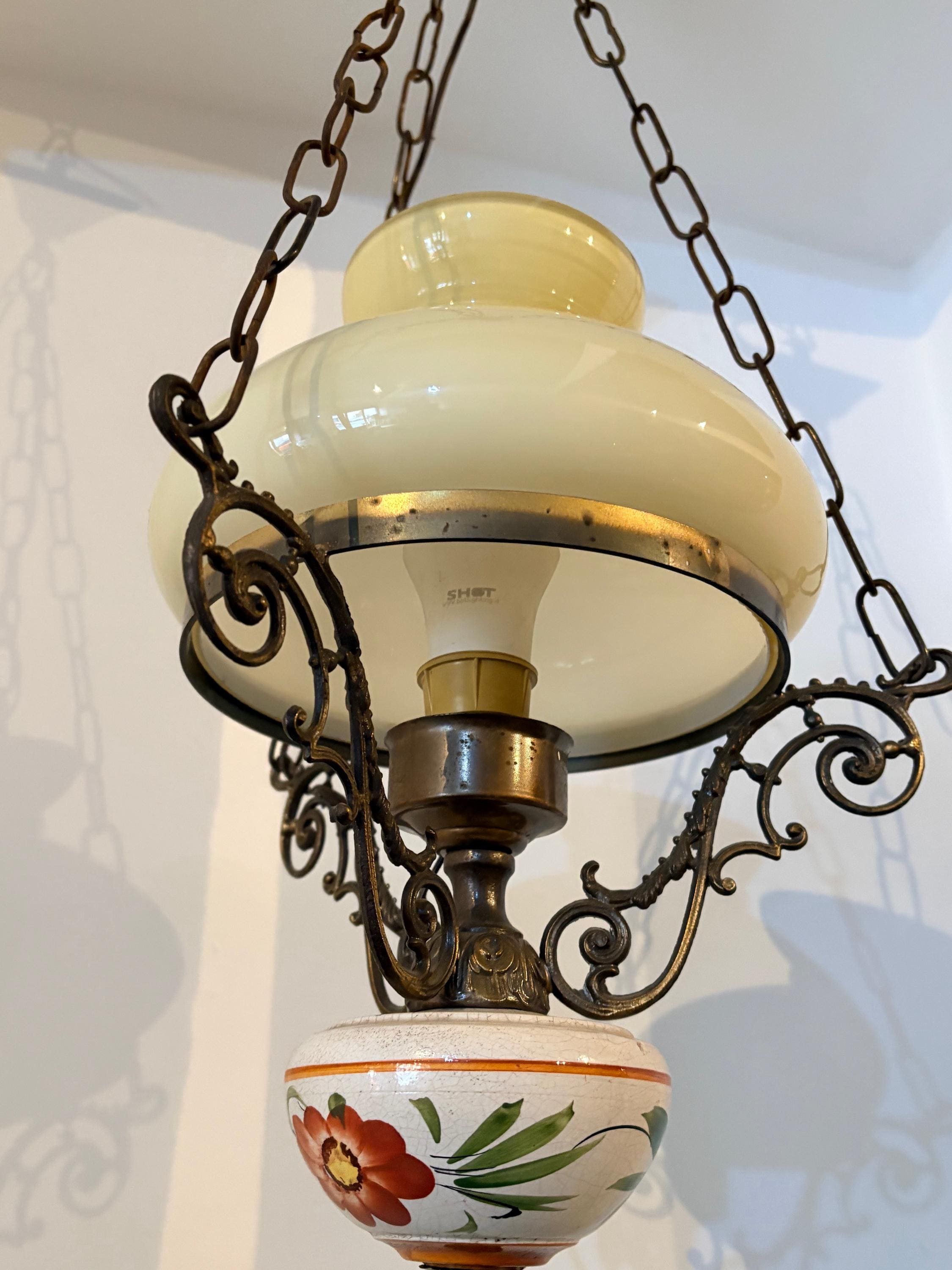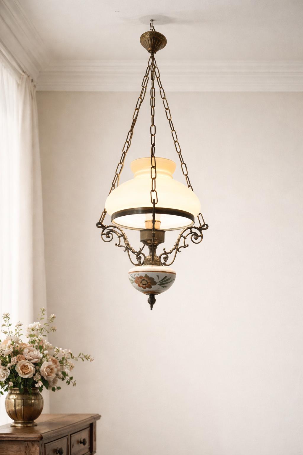 The chandelier has a brass structure with chains supporting the entire body. At the center is a large cream-colored glass sphere. The finial features a large wooden sphere with floral decoration typical of the period.