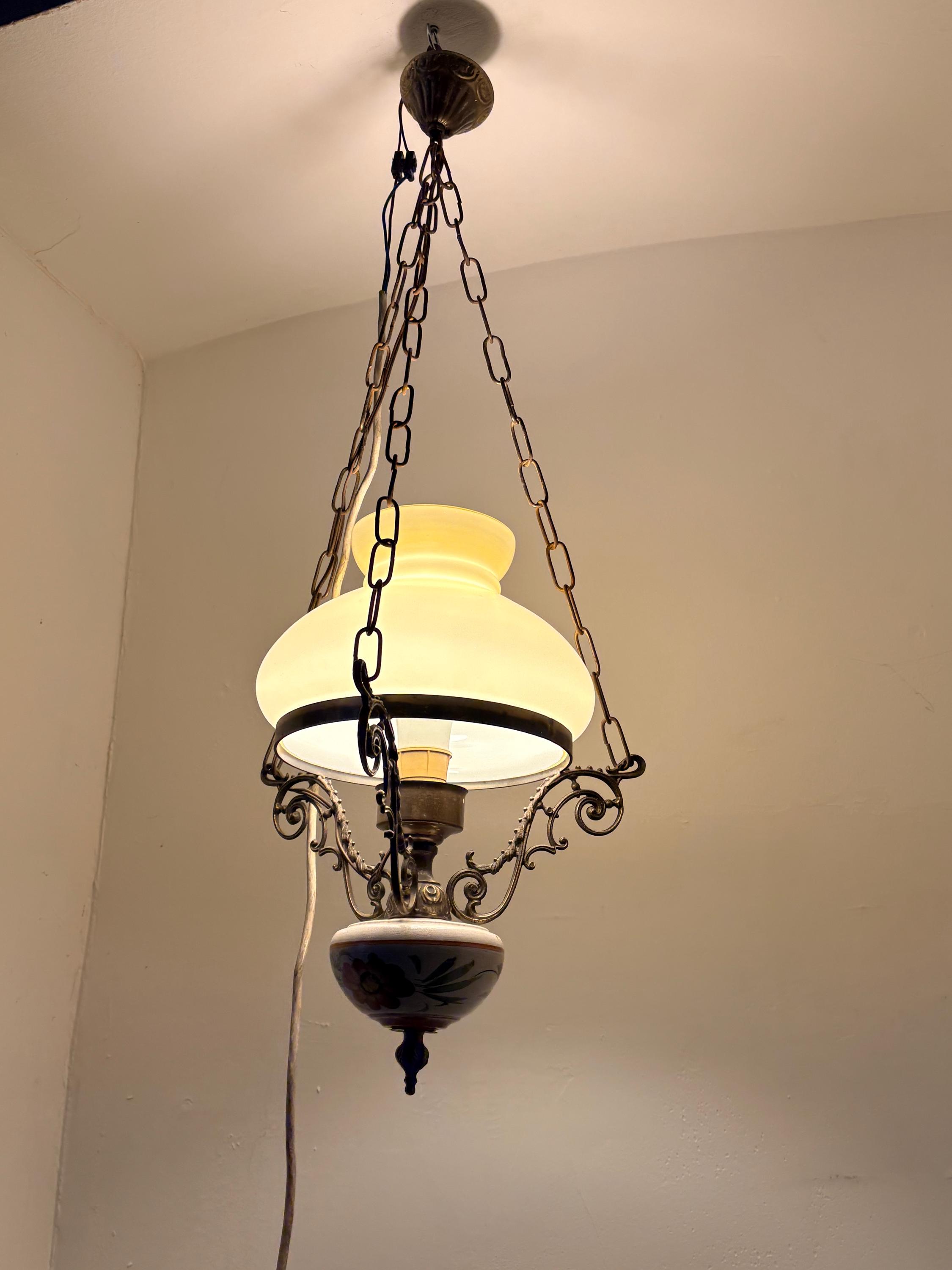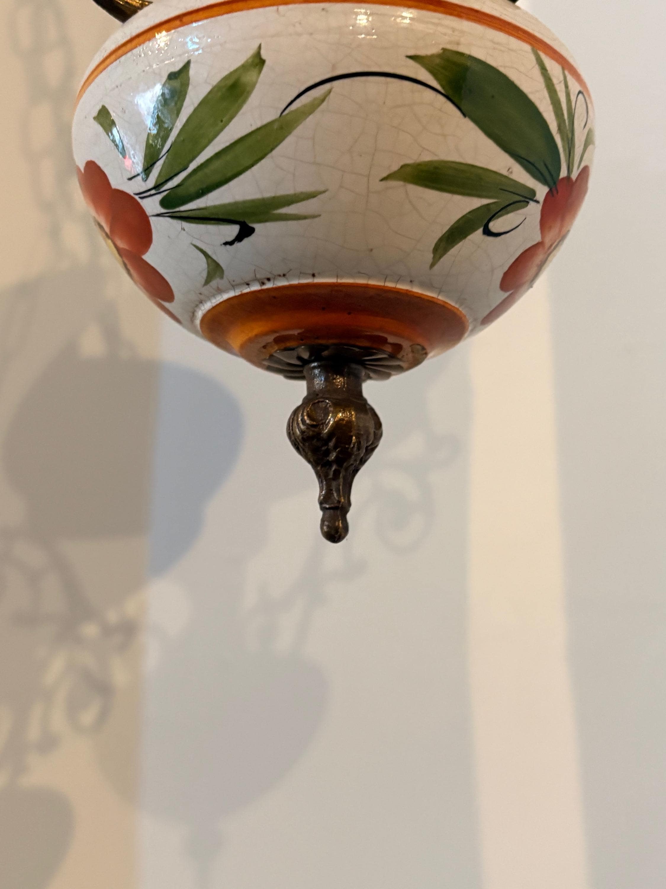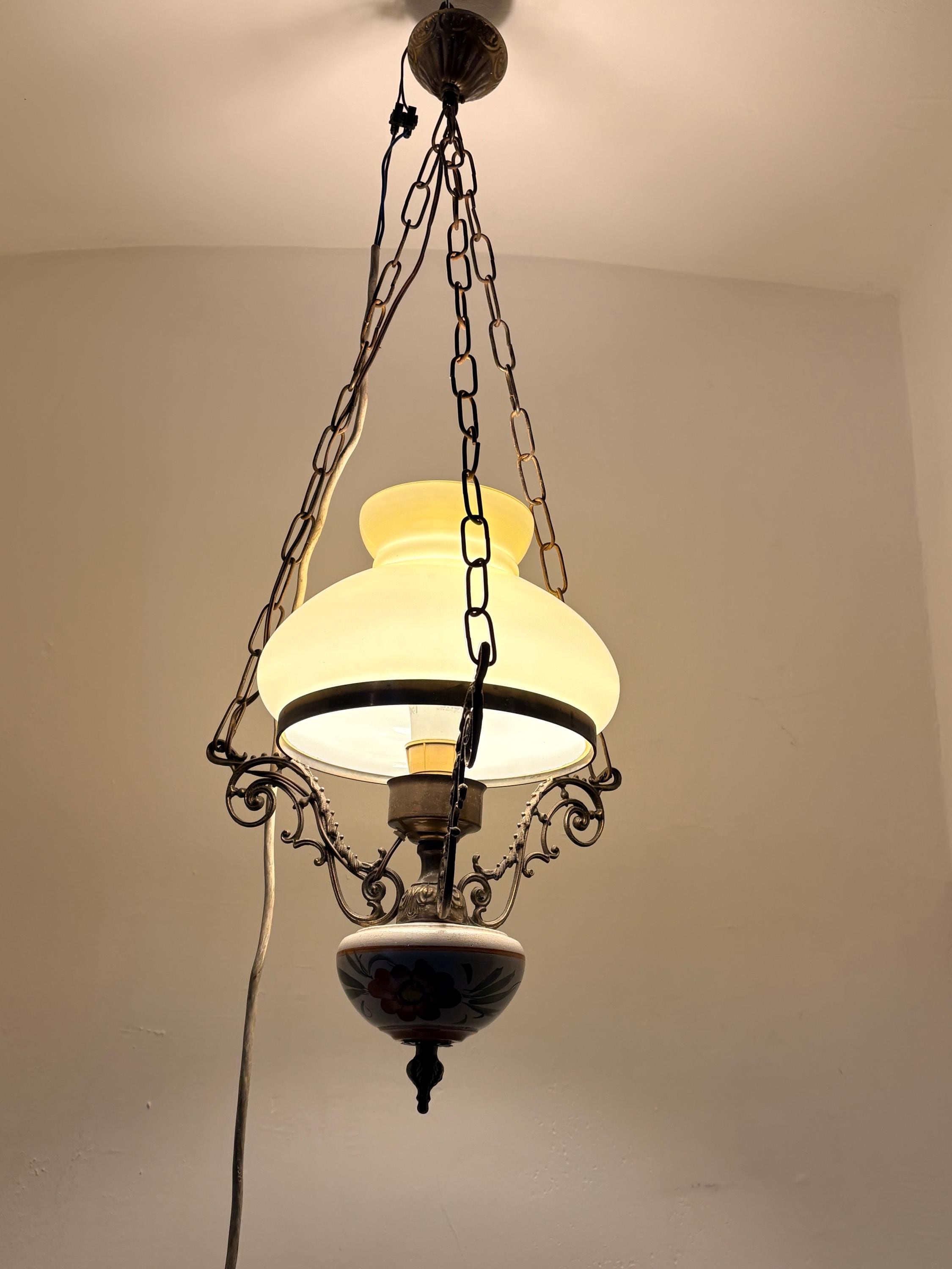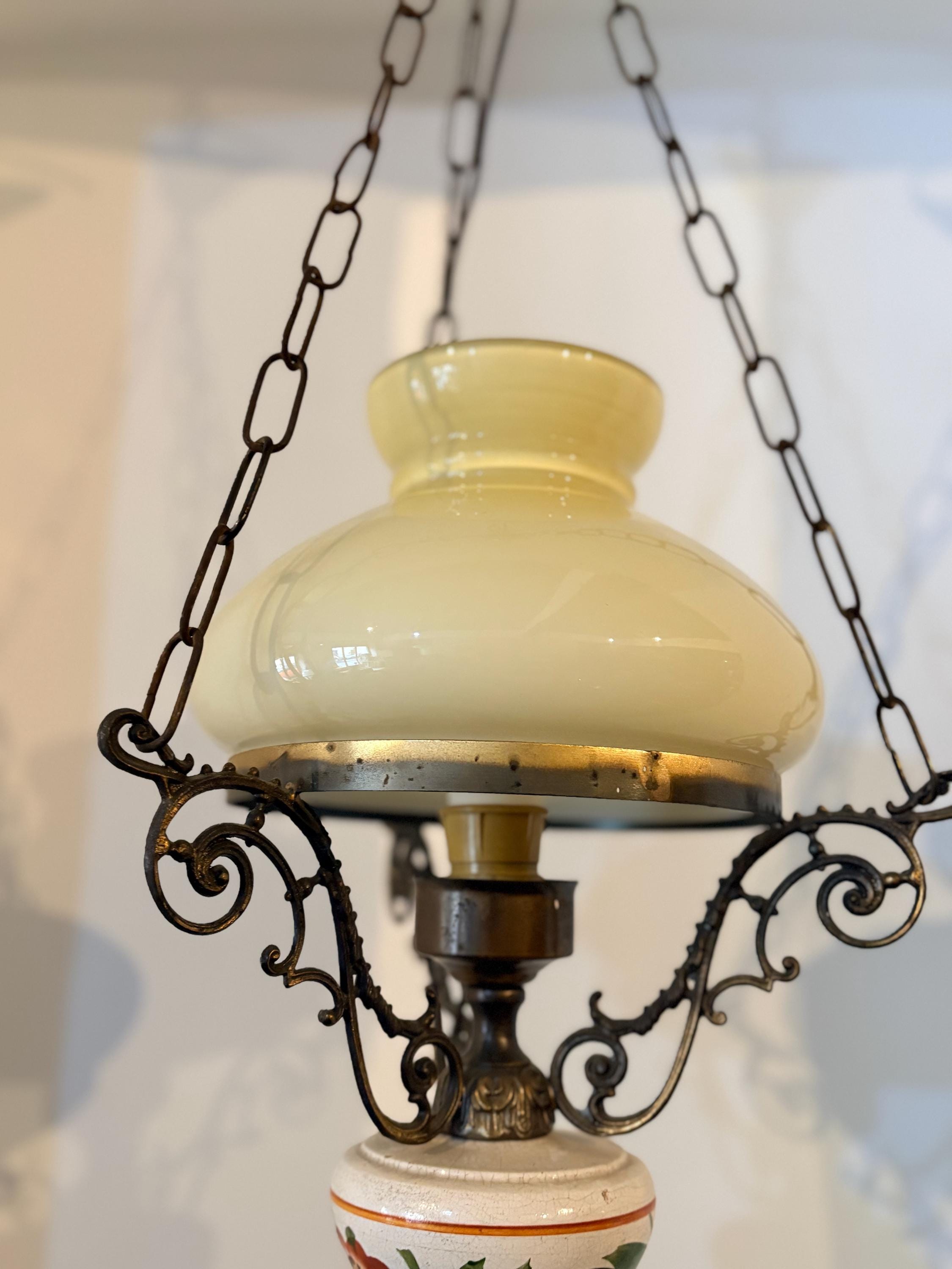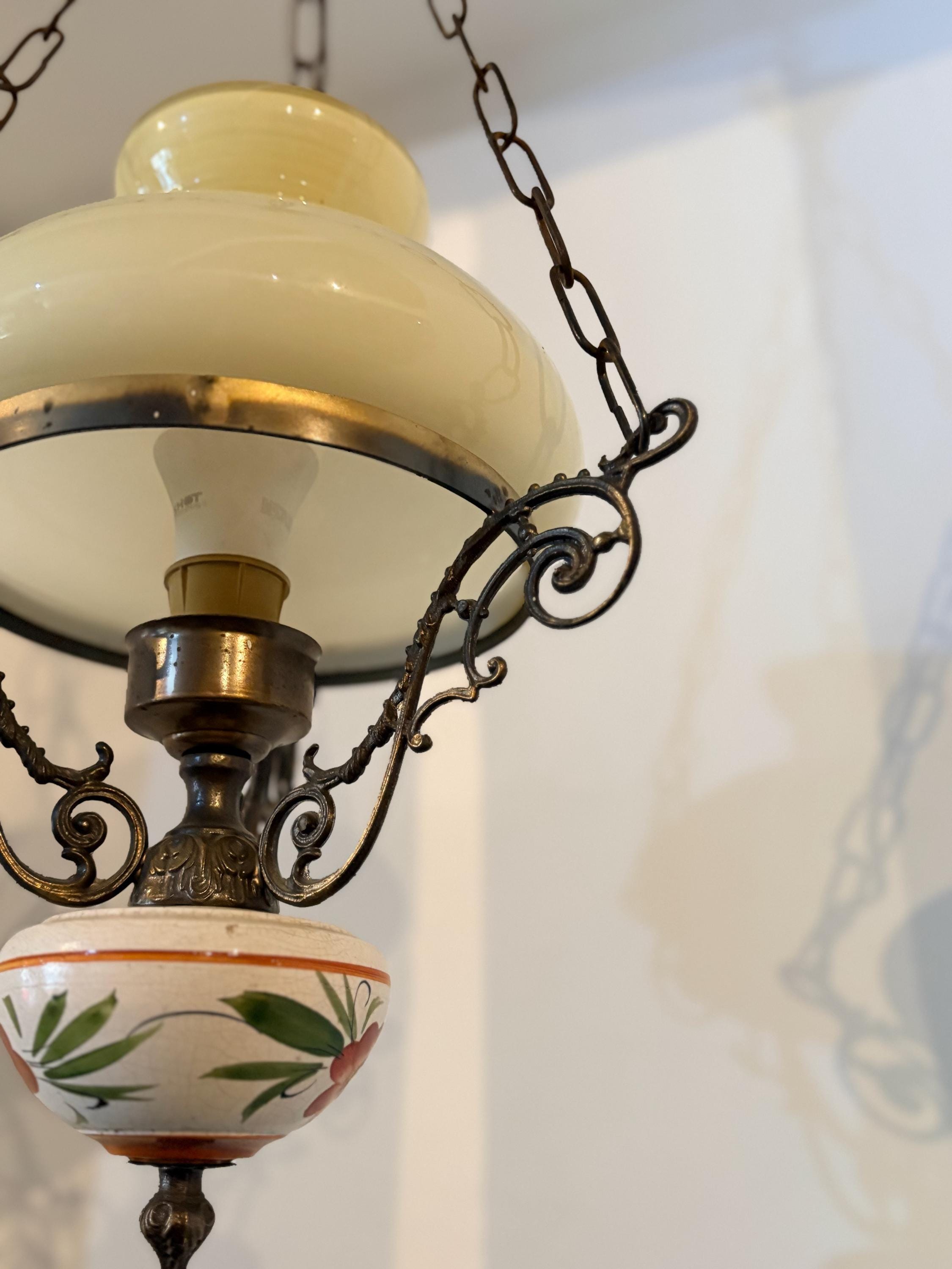 The chandelier has a brass structure with chains supporting the entire body. At the center is a large cream-colored glass sphere. The finial features a large wooden sphere with floral decoration typical of the period.