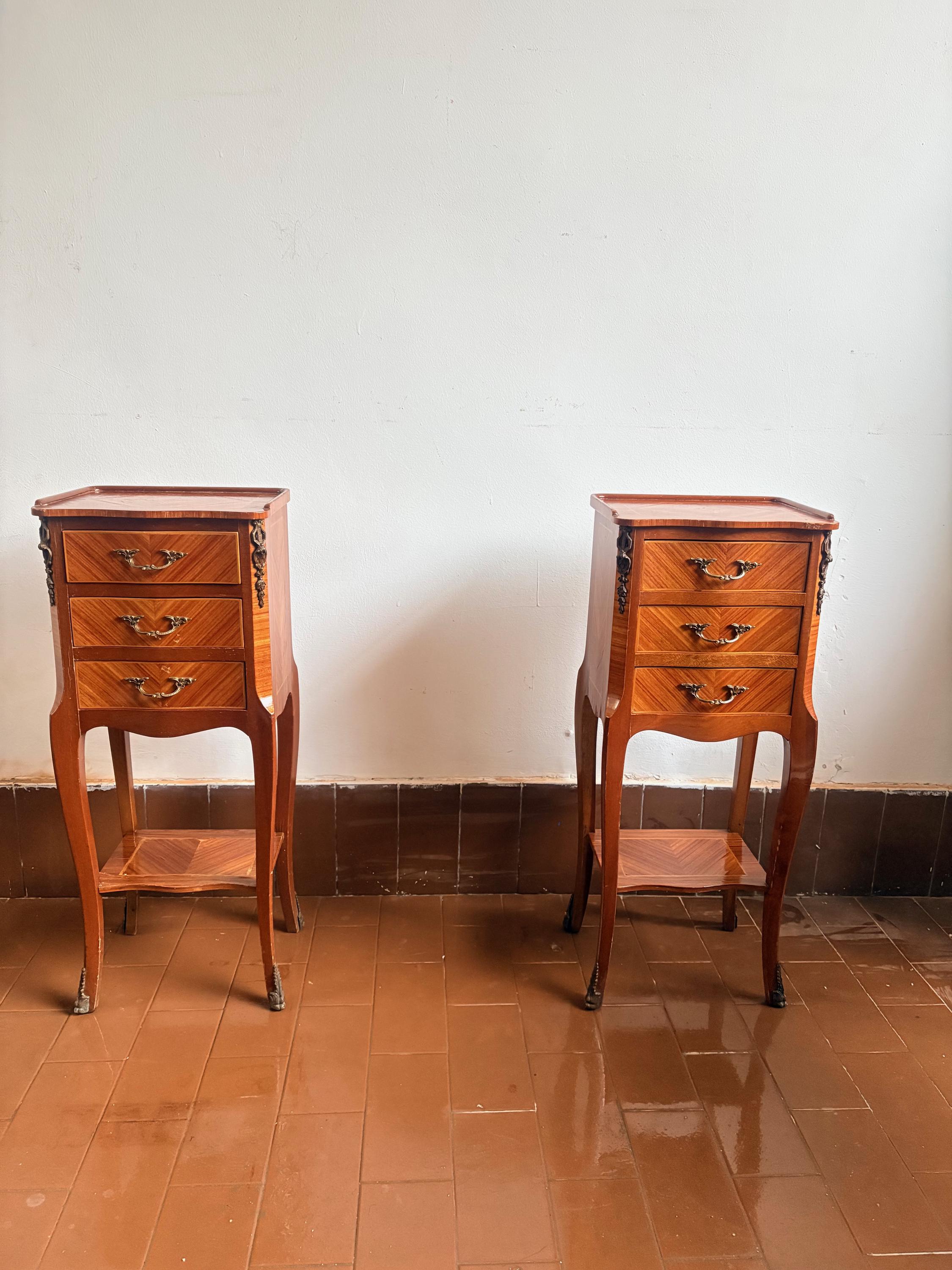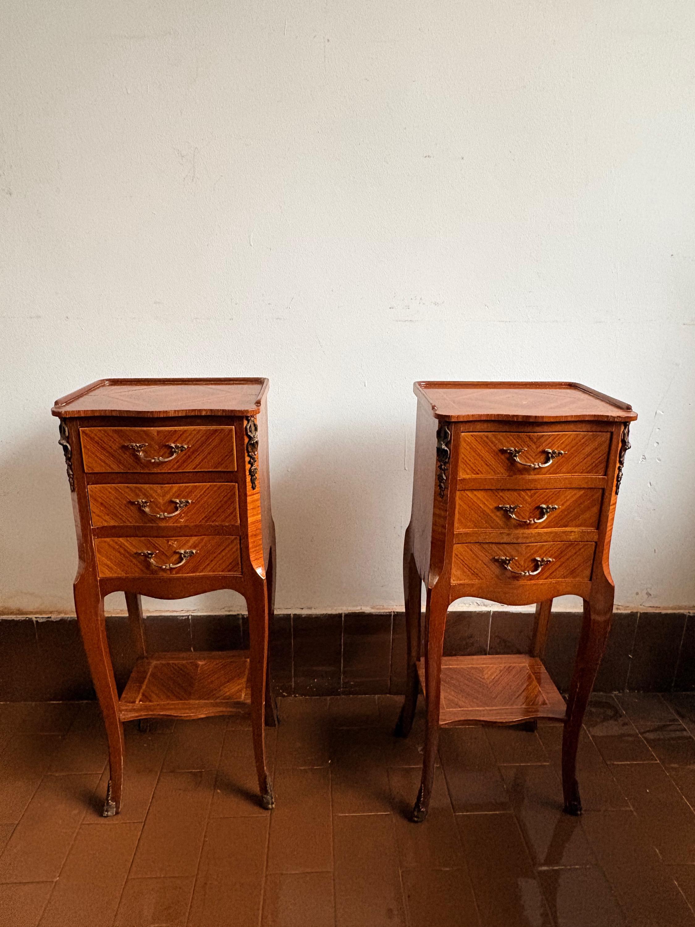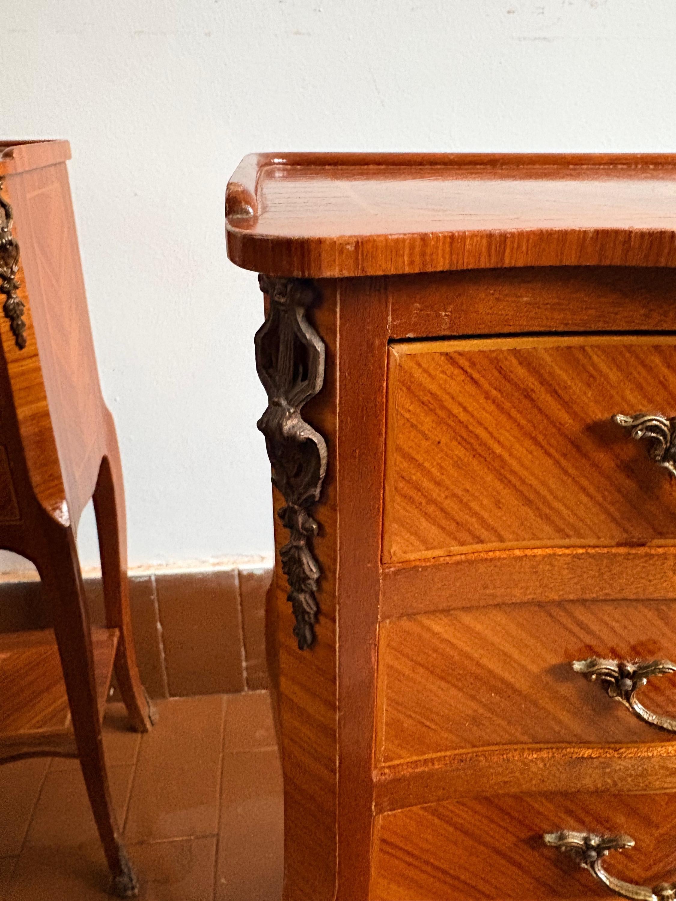 Pair of wooden bedside tables, handcrafted in the 1950s in burl wood, with three drawers and brass details.