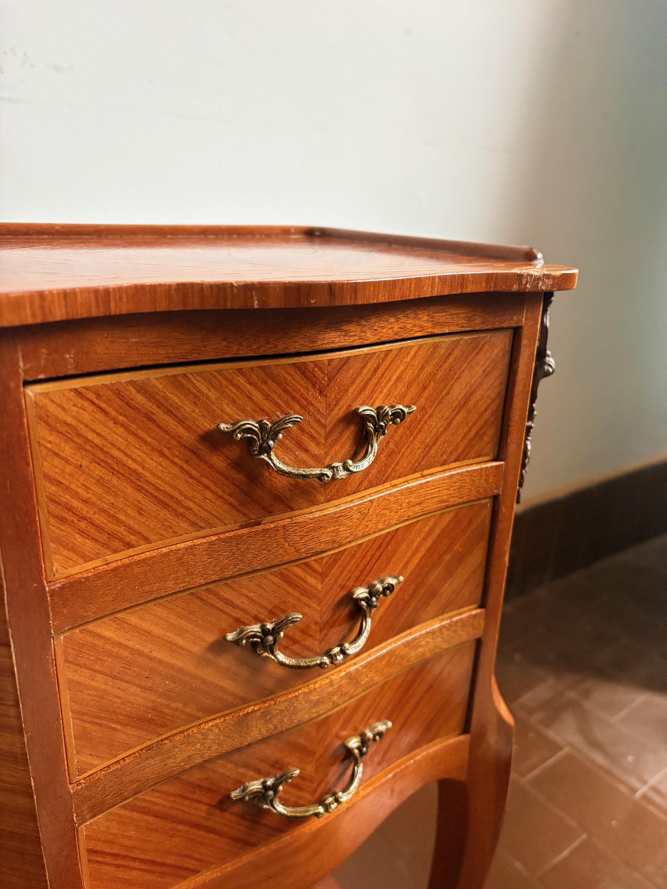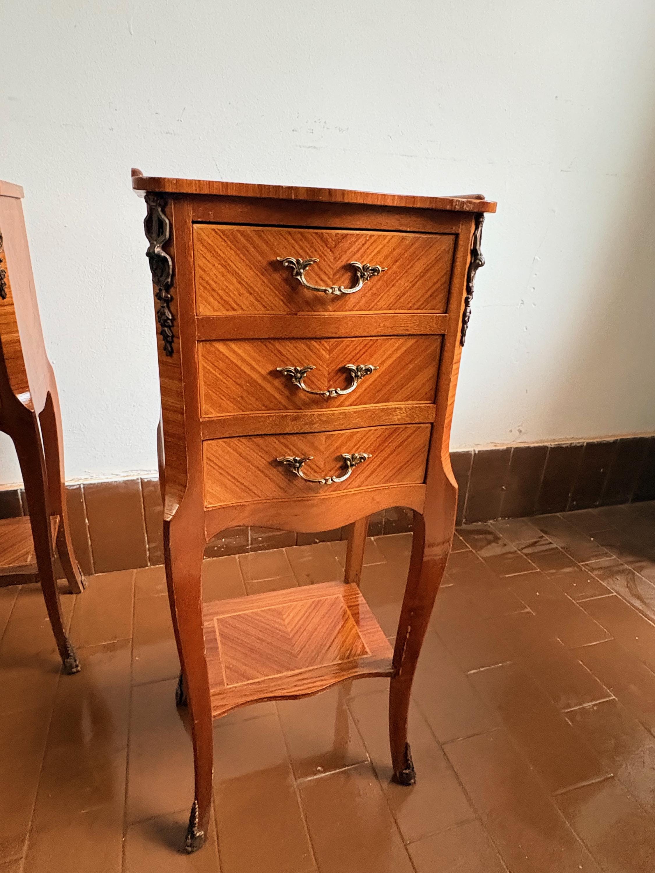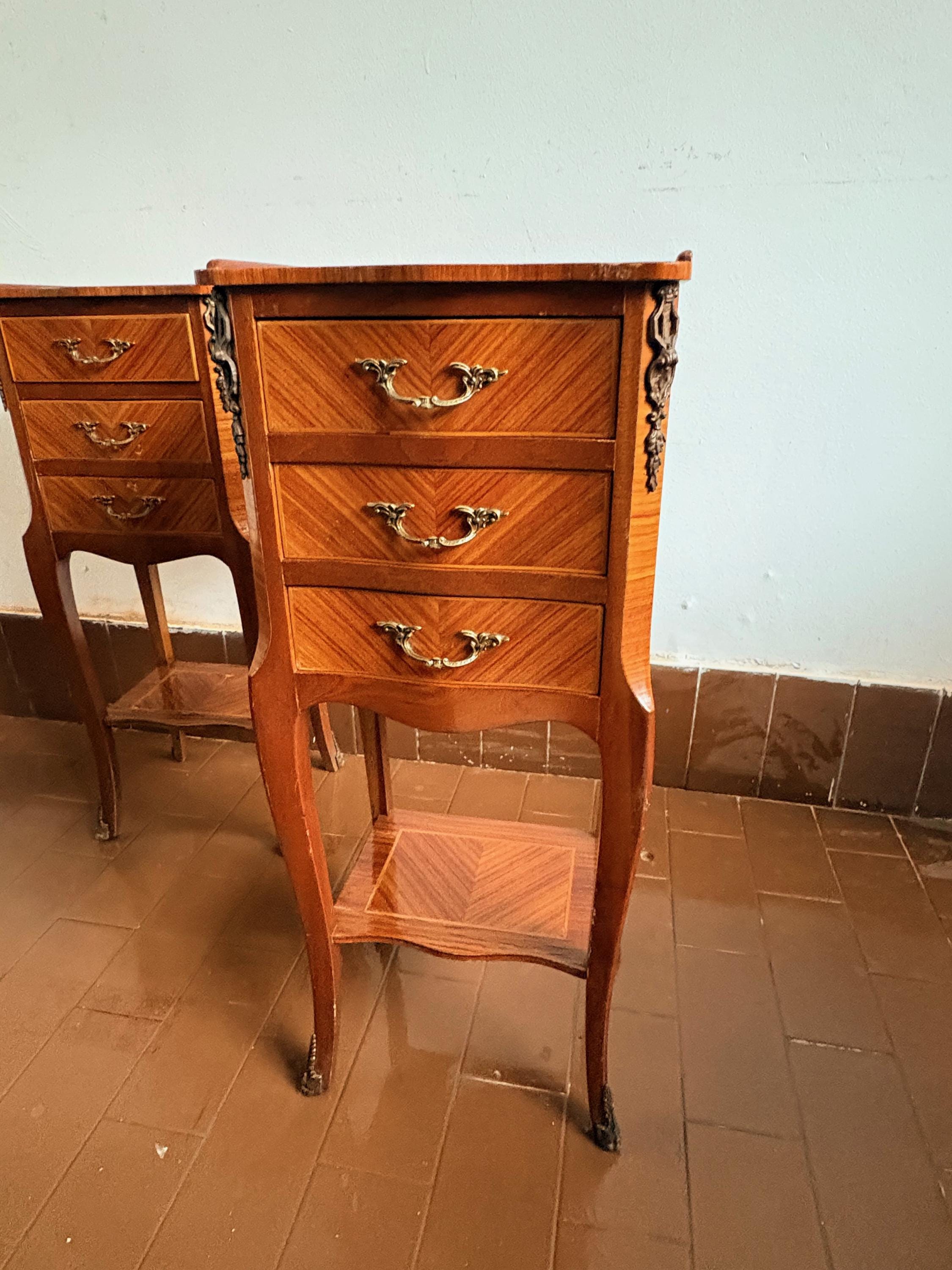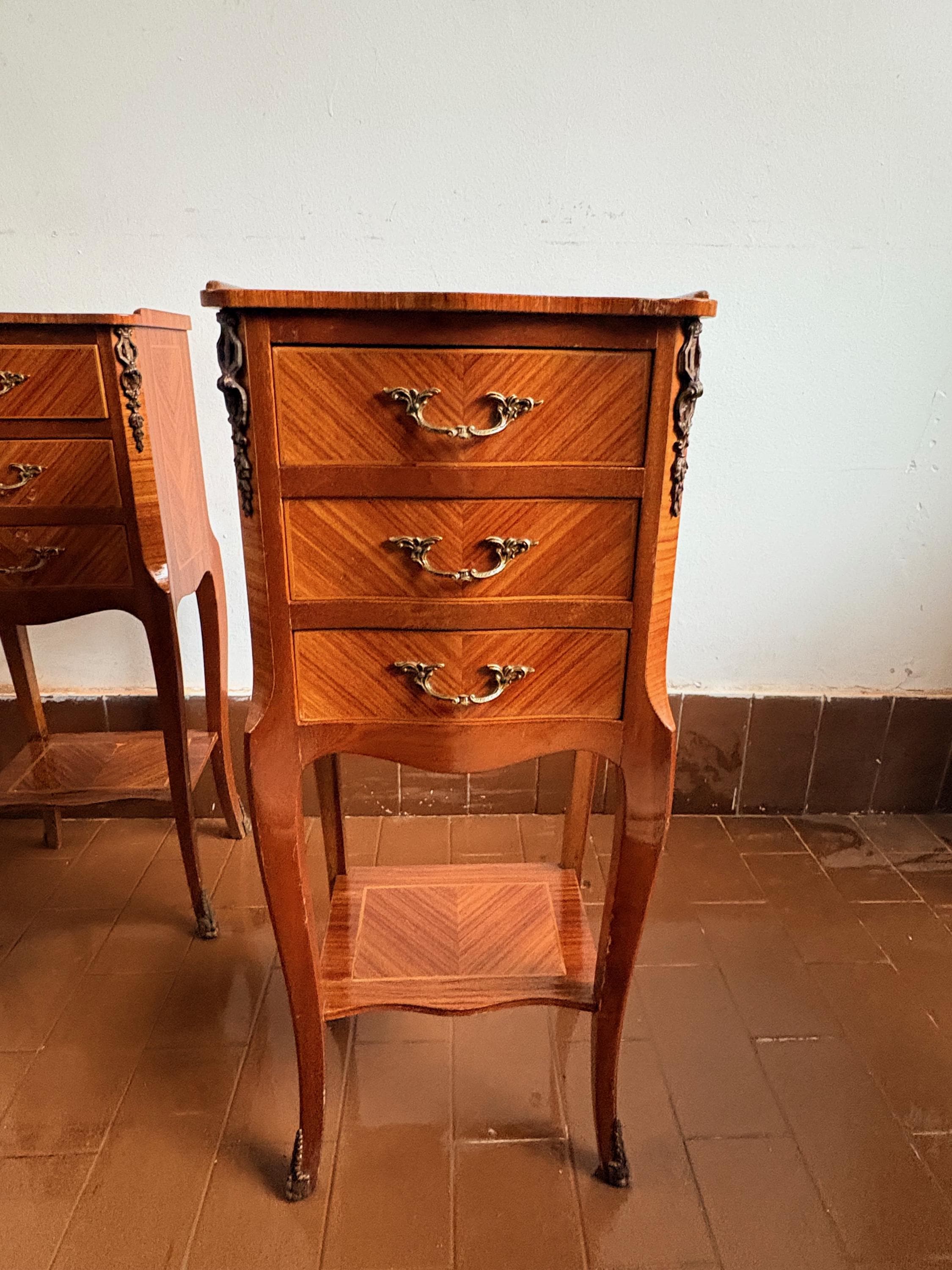 Pair of wooden bedside tables, handcrafted in the 1950s in burl wood, with three drawers and brass details.