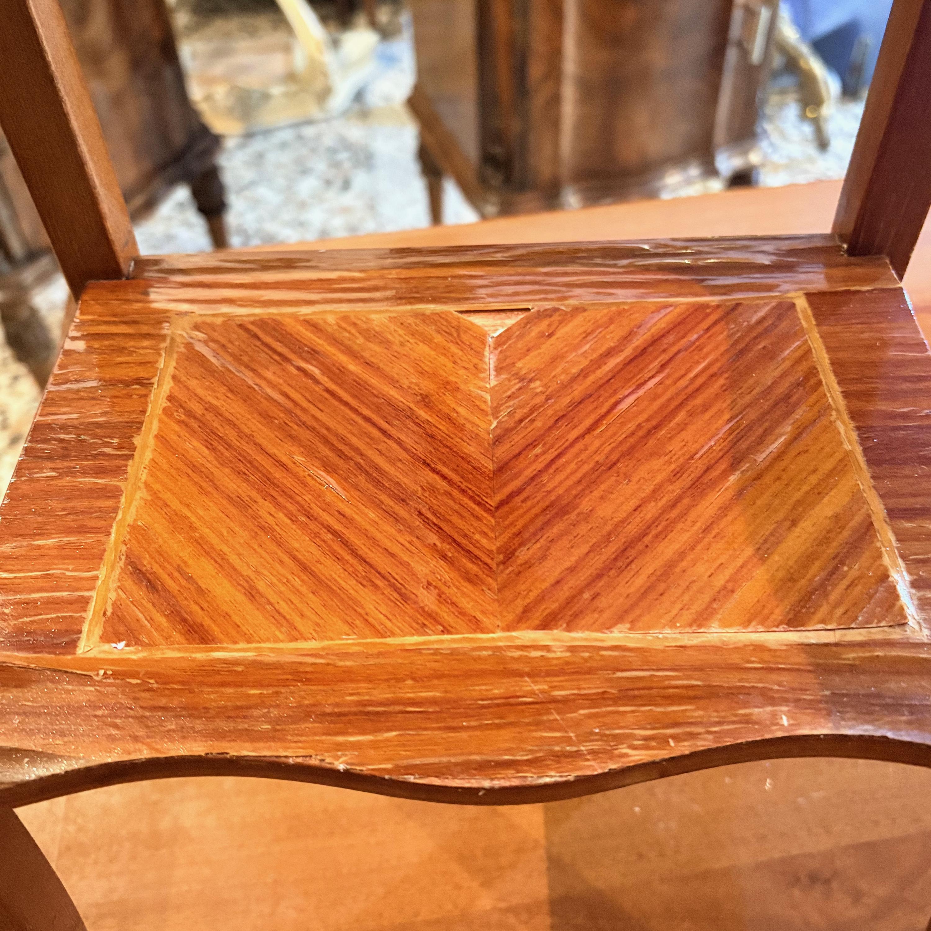 The pair is in good condition, with minor signs of wear on both pieces. One of the shelves has a small defect in the burl wood (see photo).