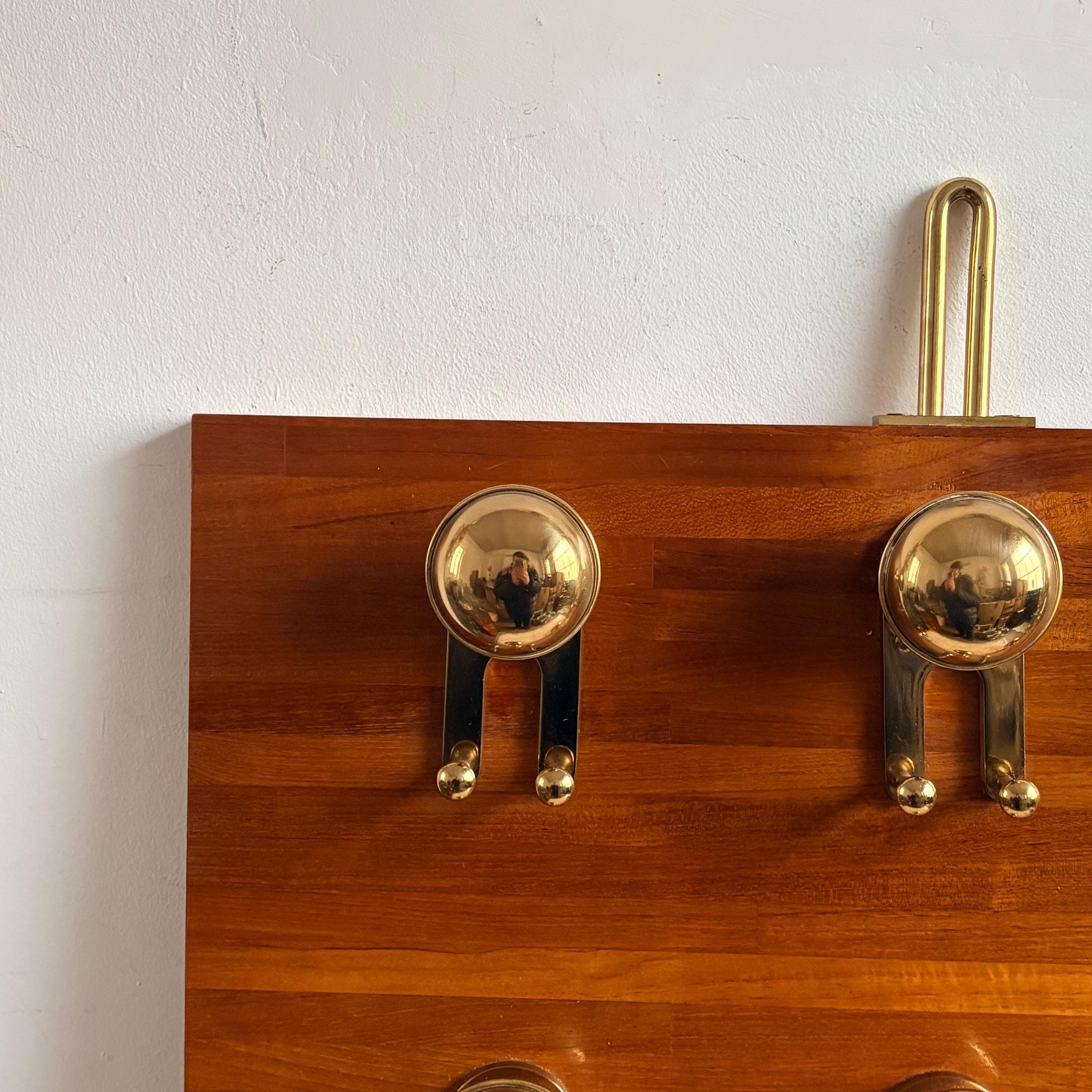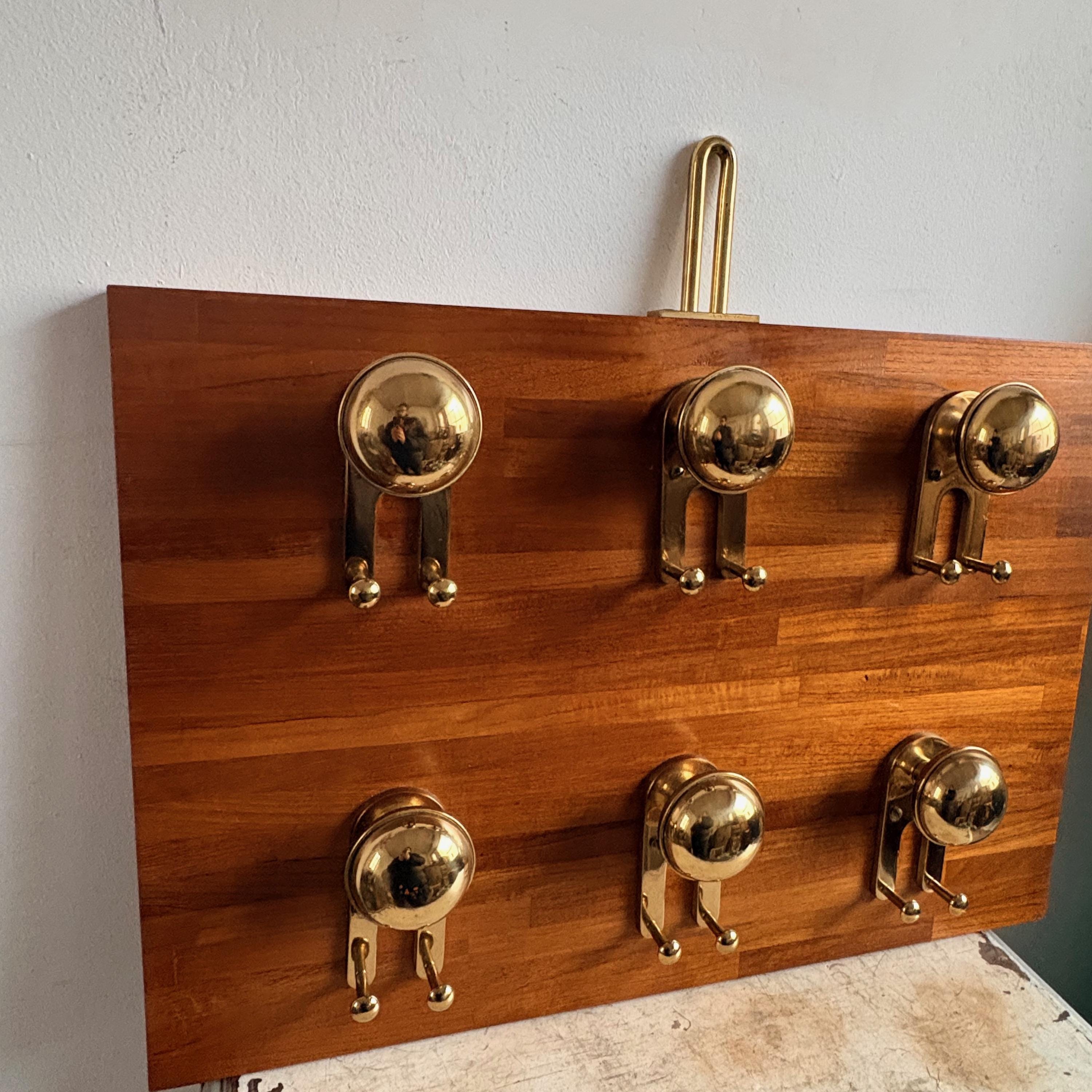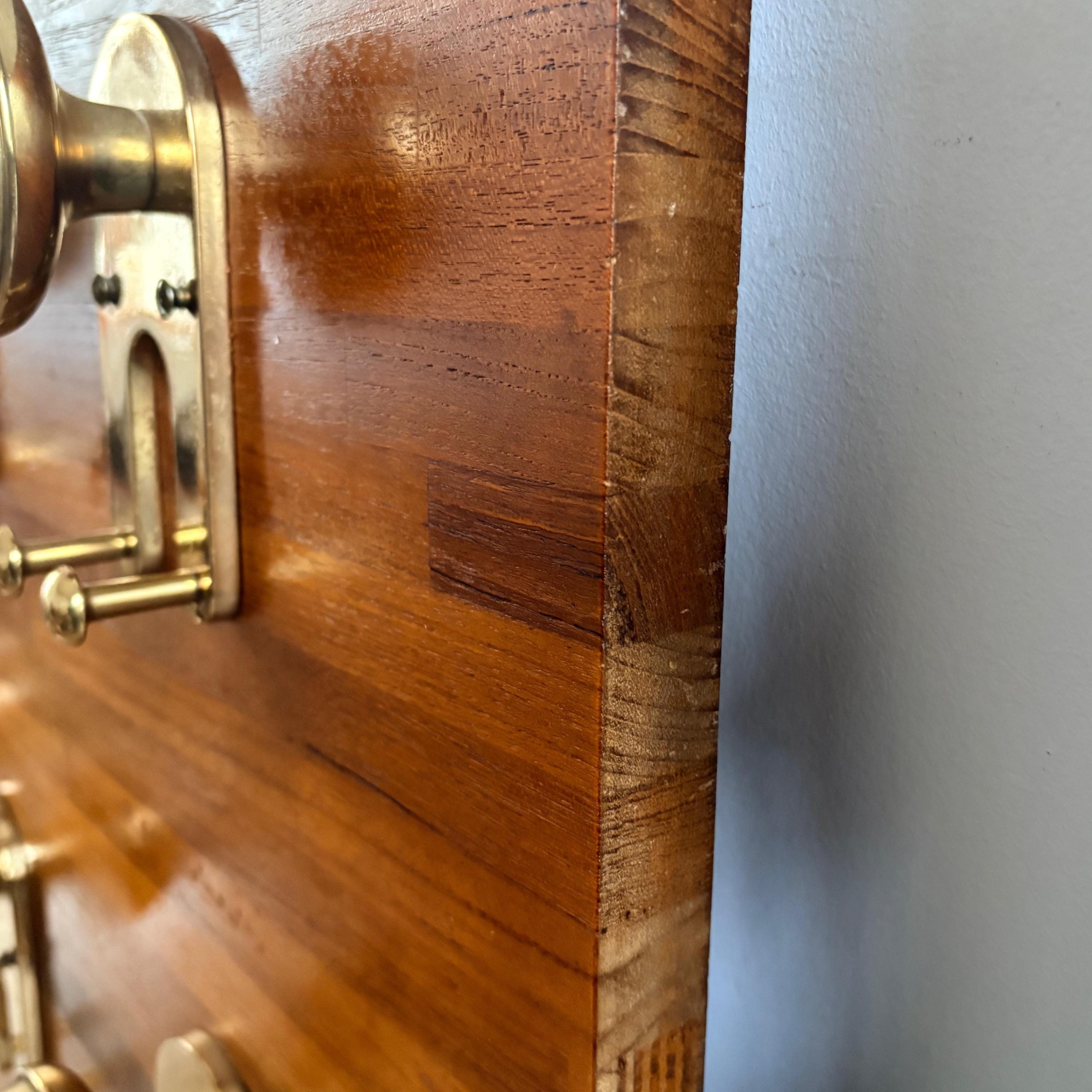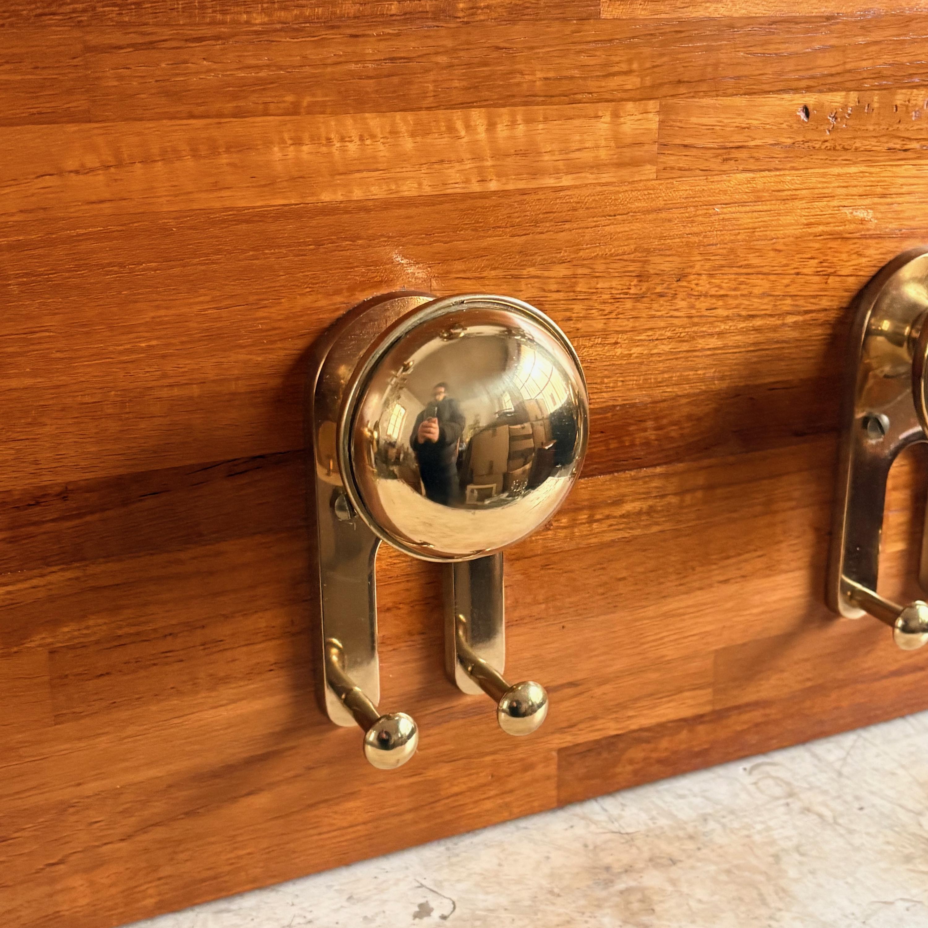 The coat rack has a solid wood body with polished gold-colored brass knobs and details. The style is reminiscent of nautical design, making it a valuable and hard-to-find item.