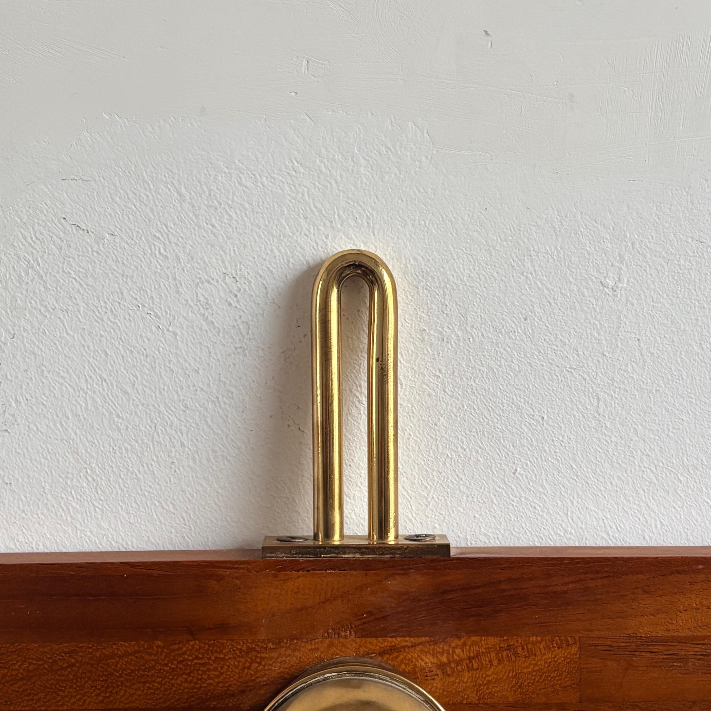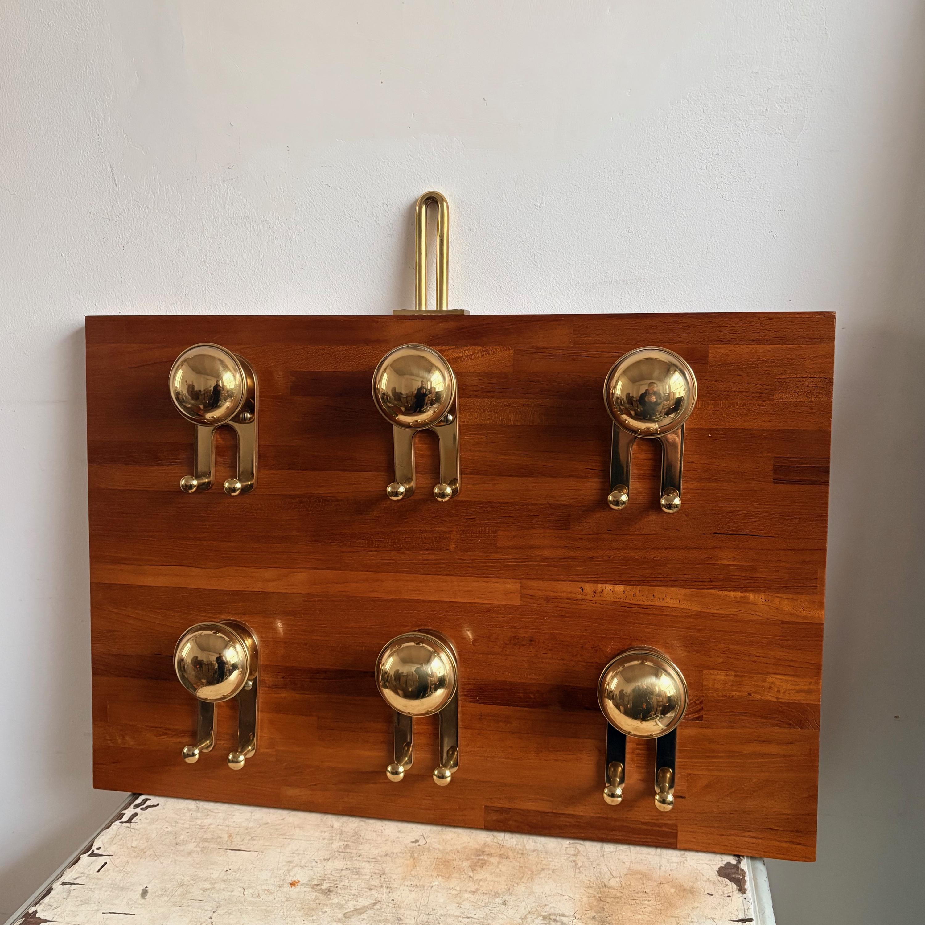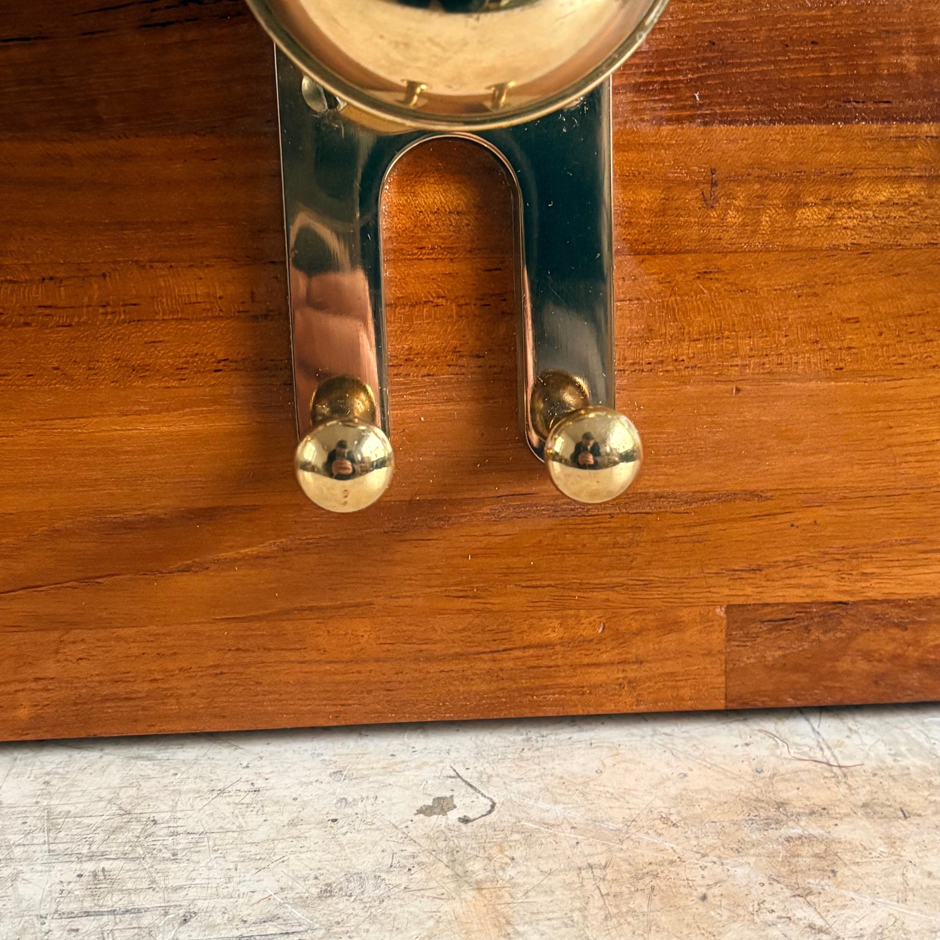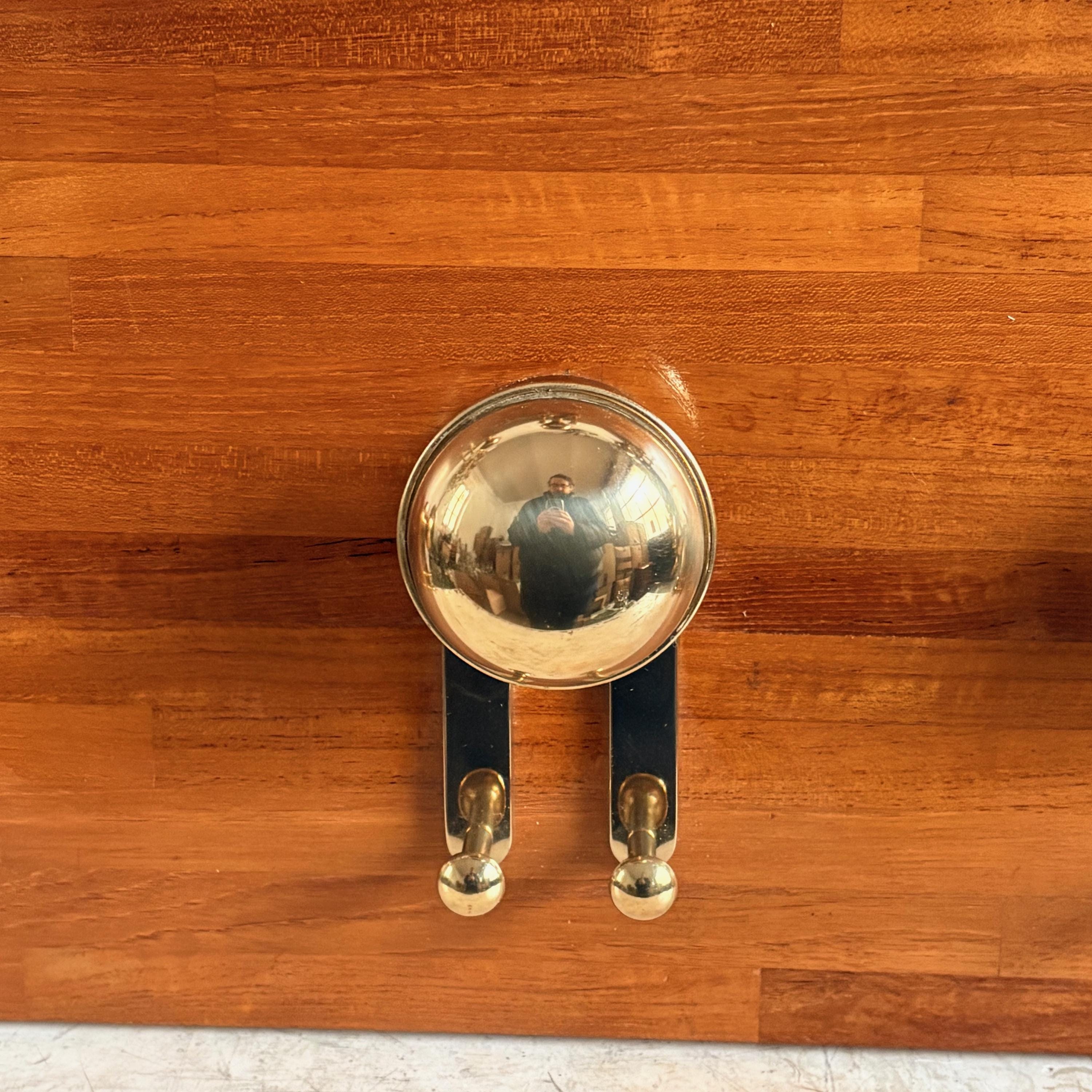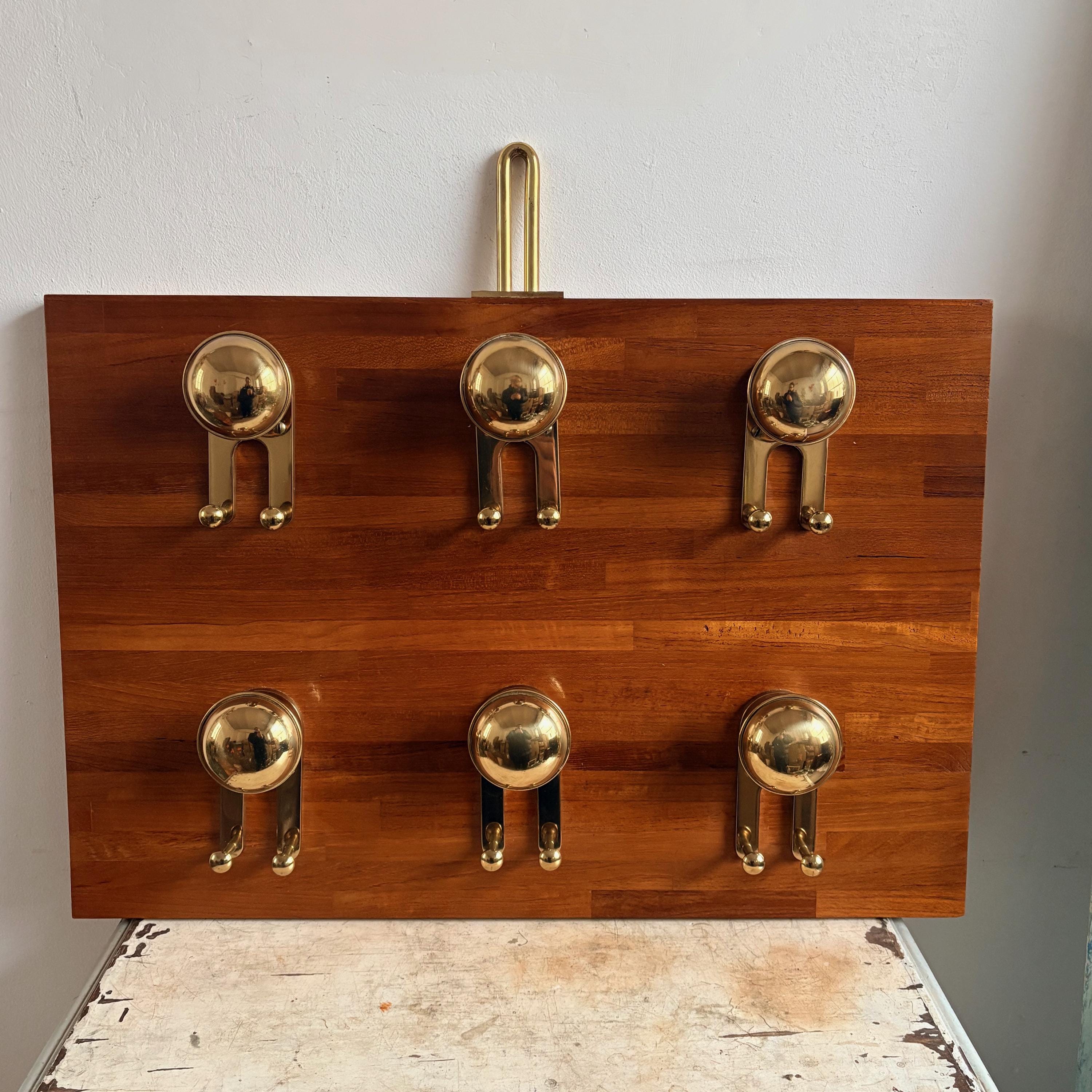 The coat rack has a solid wood body with polished gold-colored brass knobs and details. The style is reminiscent of nautical design, making it a valuable and hard-to-find item.