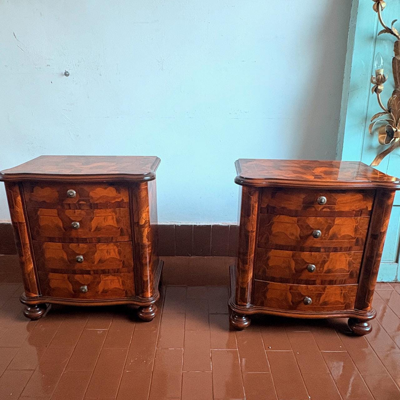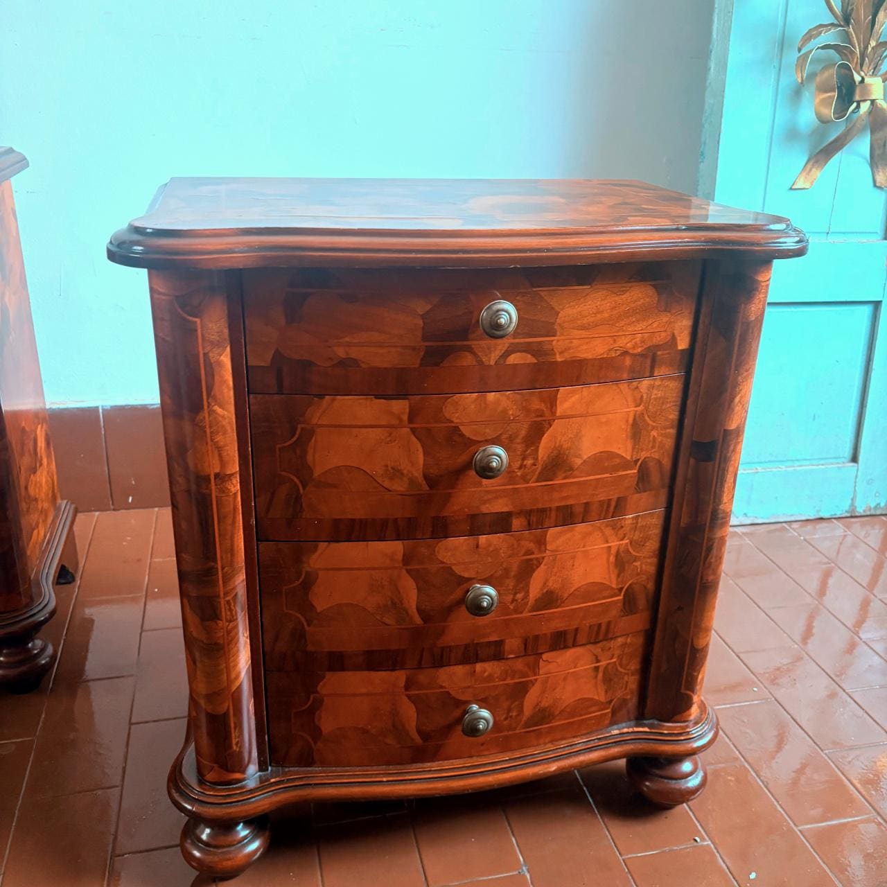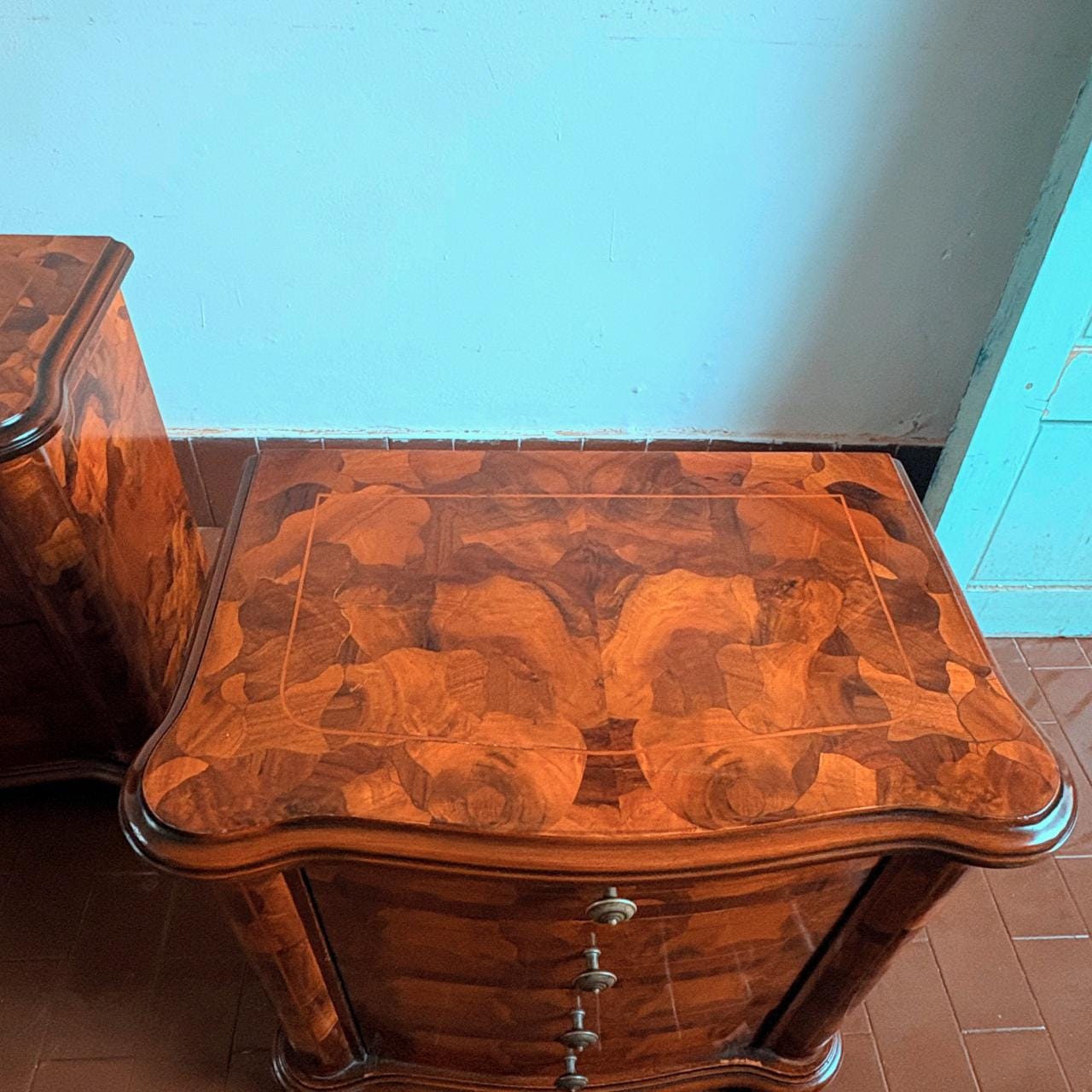 The body of the bedside tables is made of burl wood, with an elegant pattern on the sides and top. There are four spacious drawers on the front, with fine, striking brass handles.