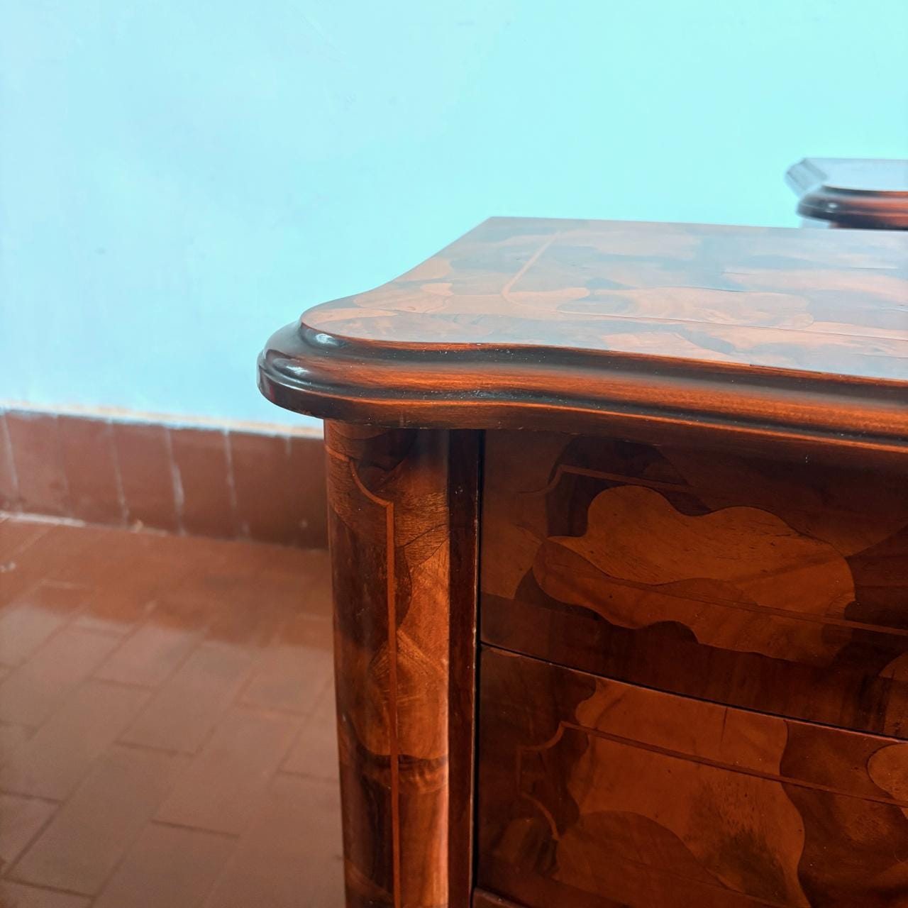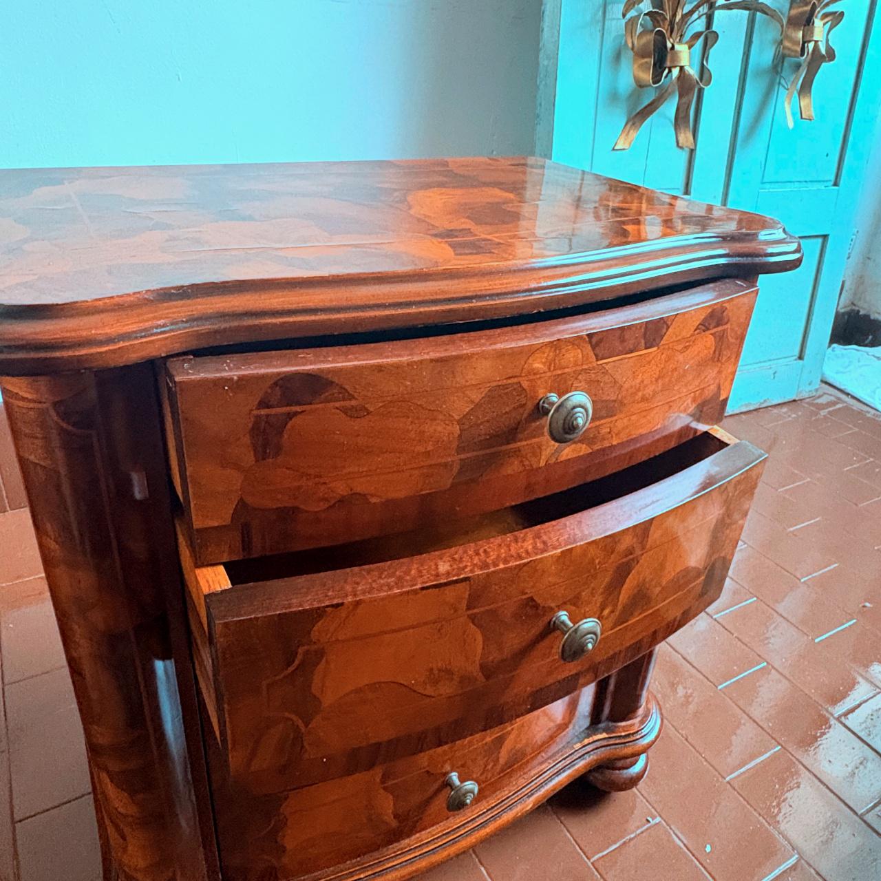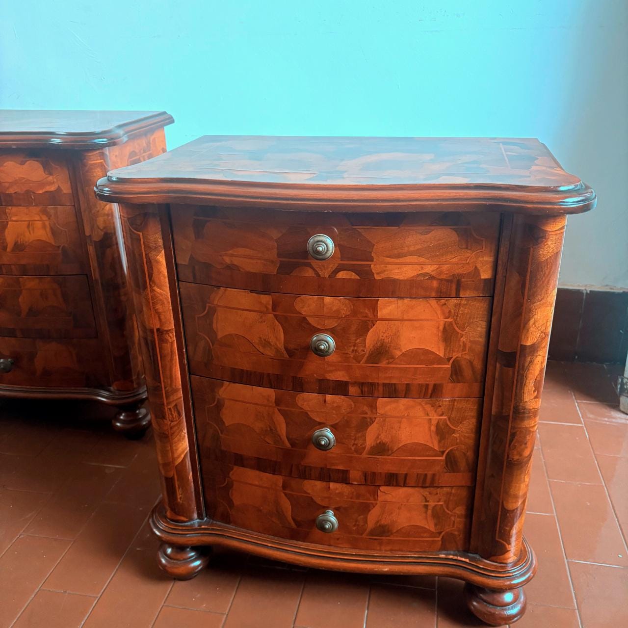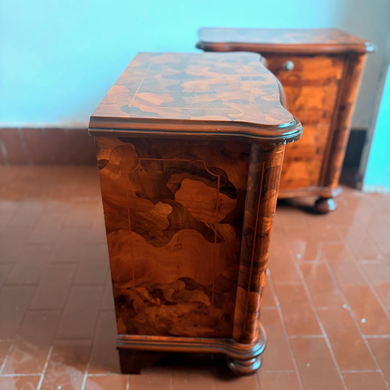 The body of the bedside tables is made of burl wood, with an elegant pattern on the sides and top. There are four spacious drawers on the front, with fine, striking brass handles.