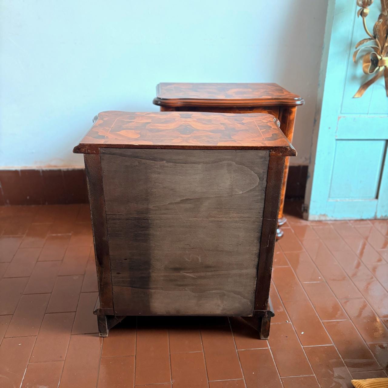 Stunning pair of burl wood bedside tables, handcrafted in Italy in the 1950s, with brass handles.