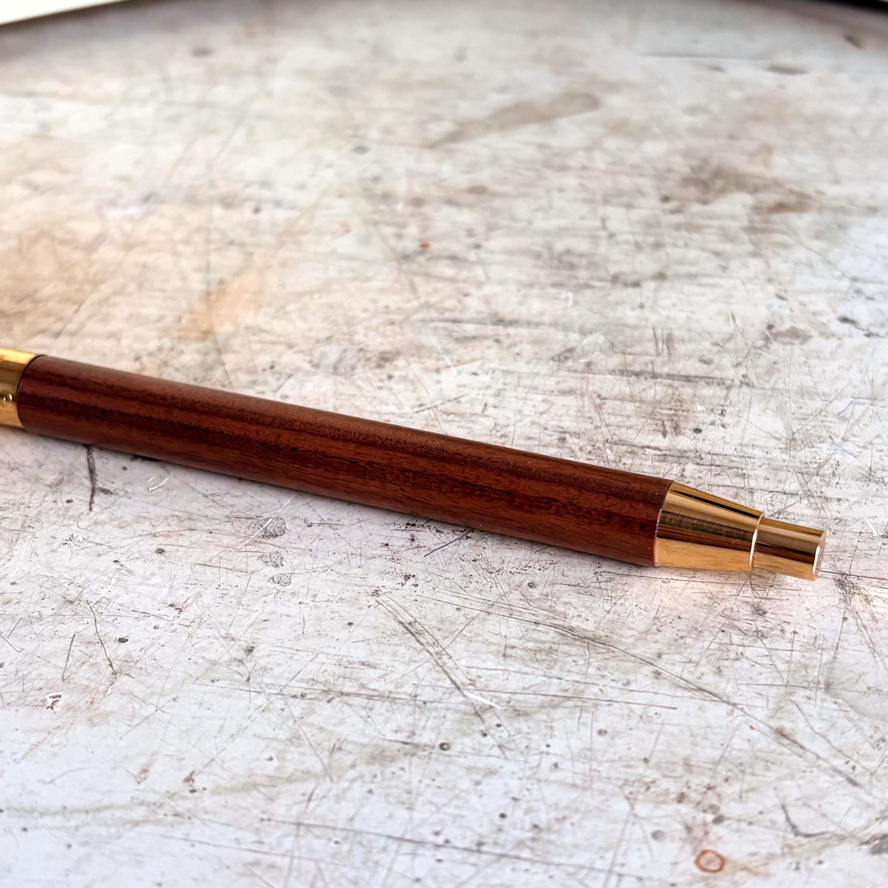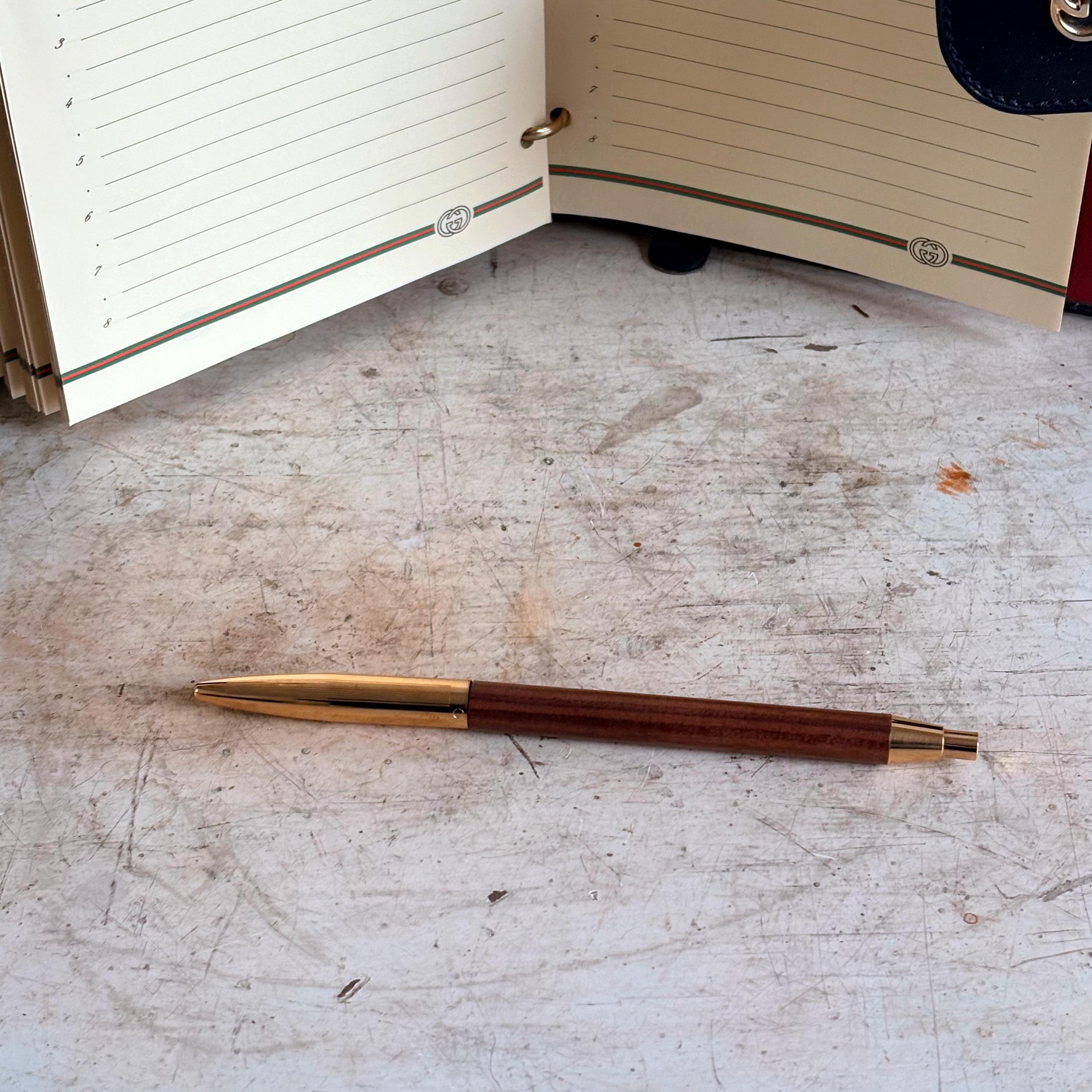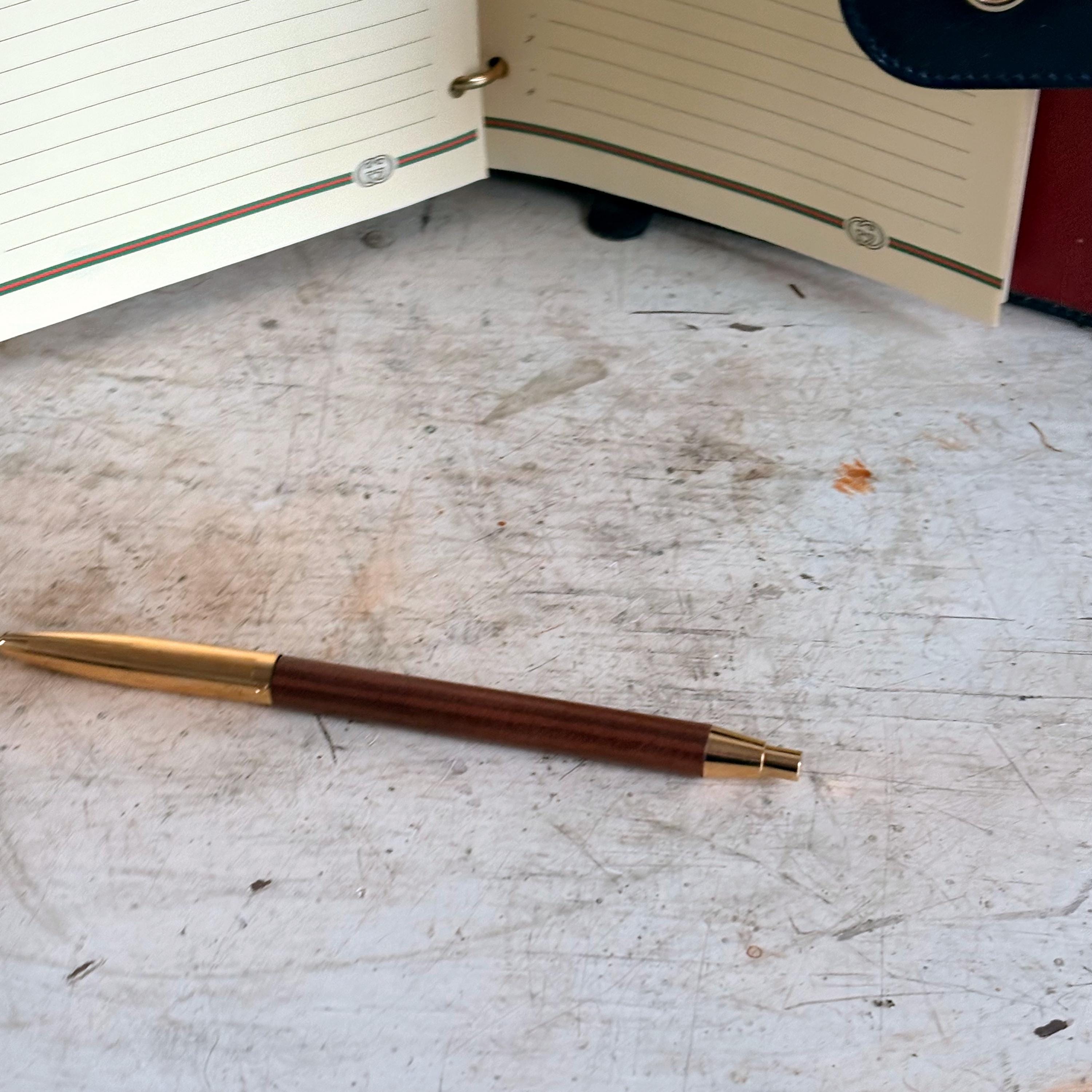 The diary holder is made of leather, black on the outside, while the inside is two-tone, red and black. It also comes with a wooden (teak) and brass pen with the logo on the bottom.