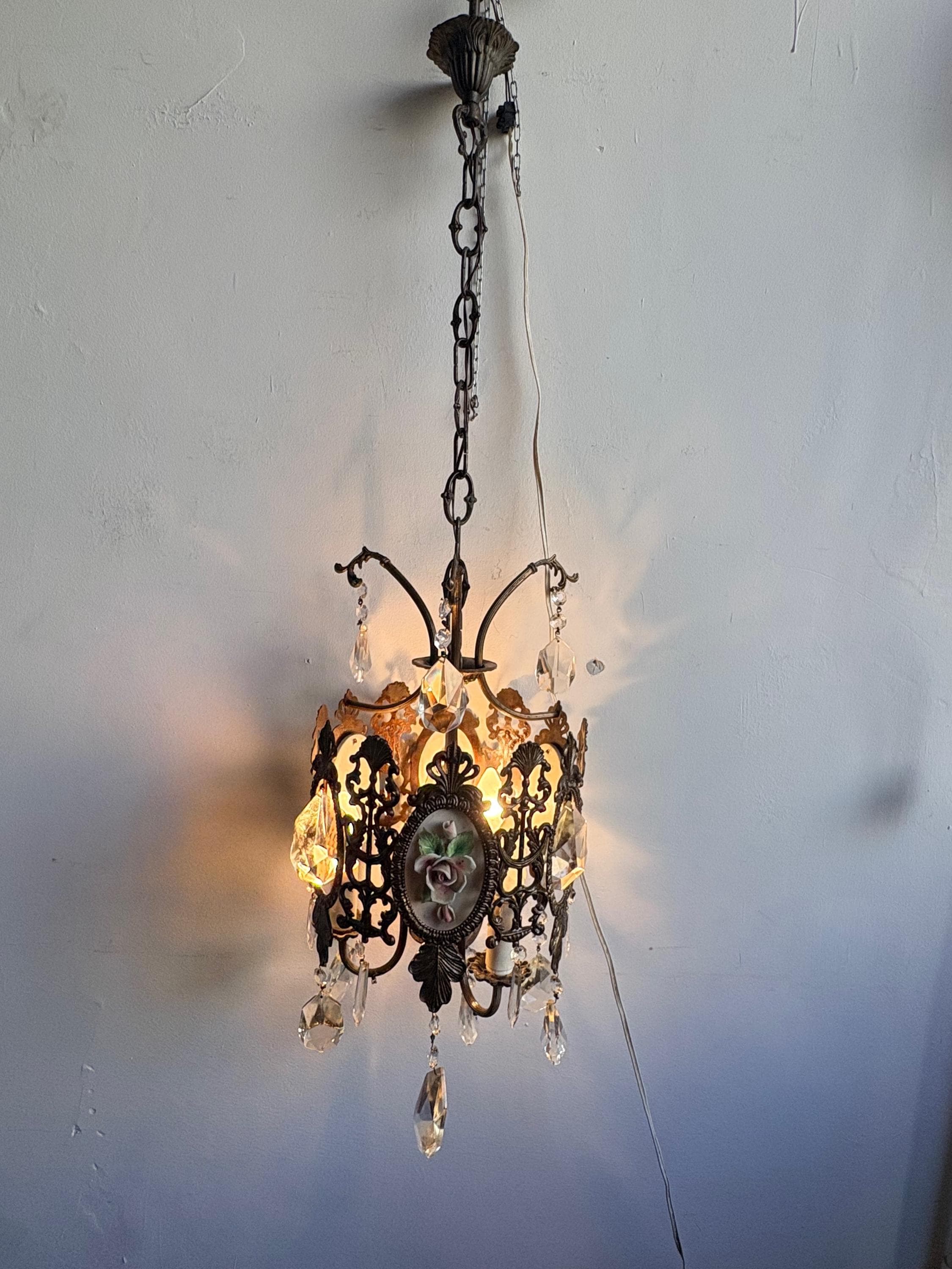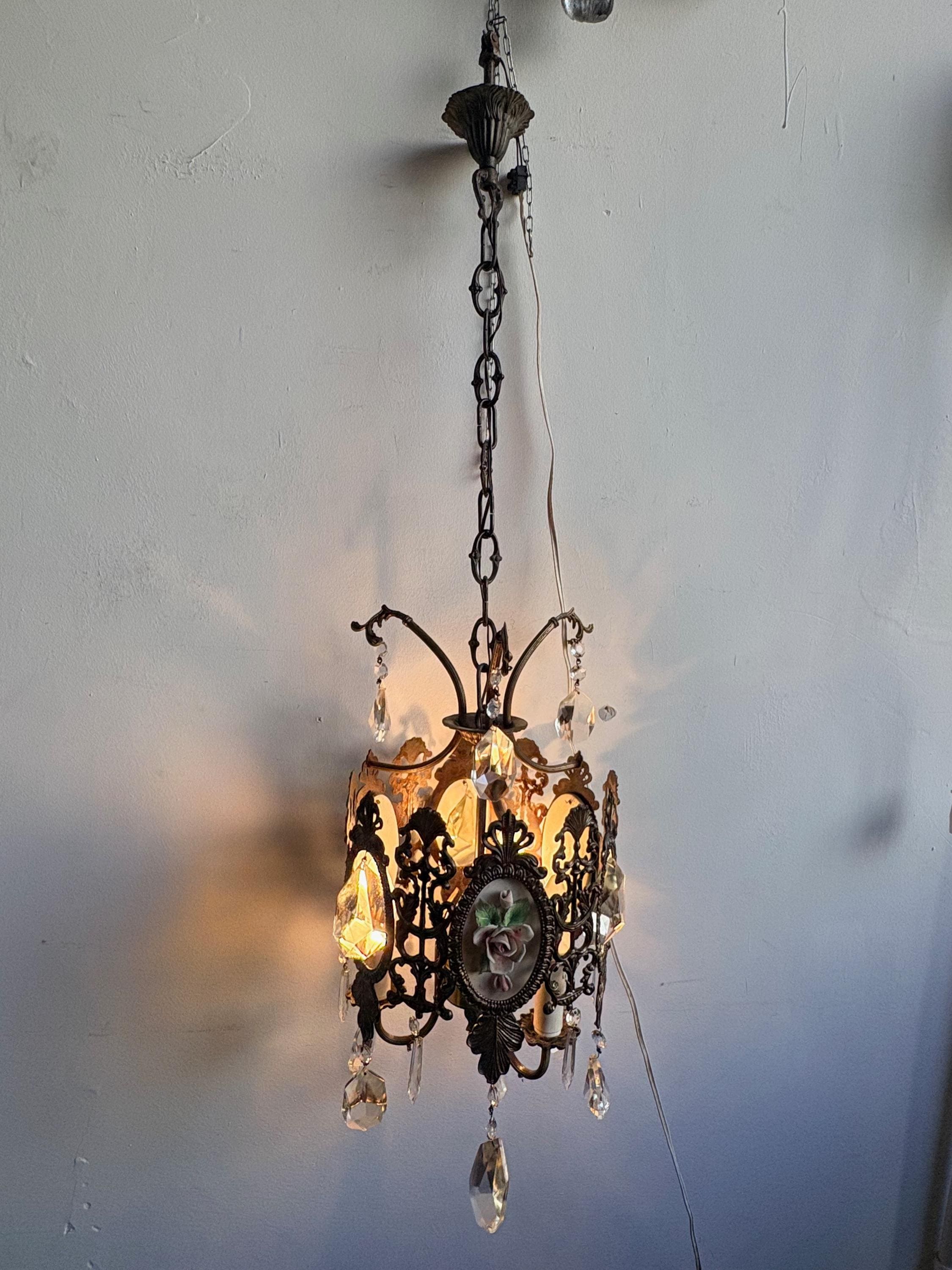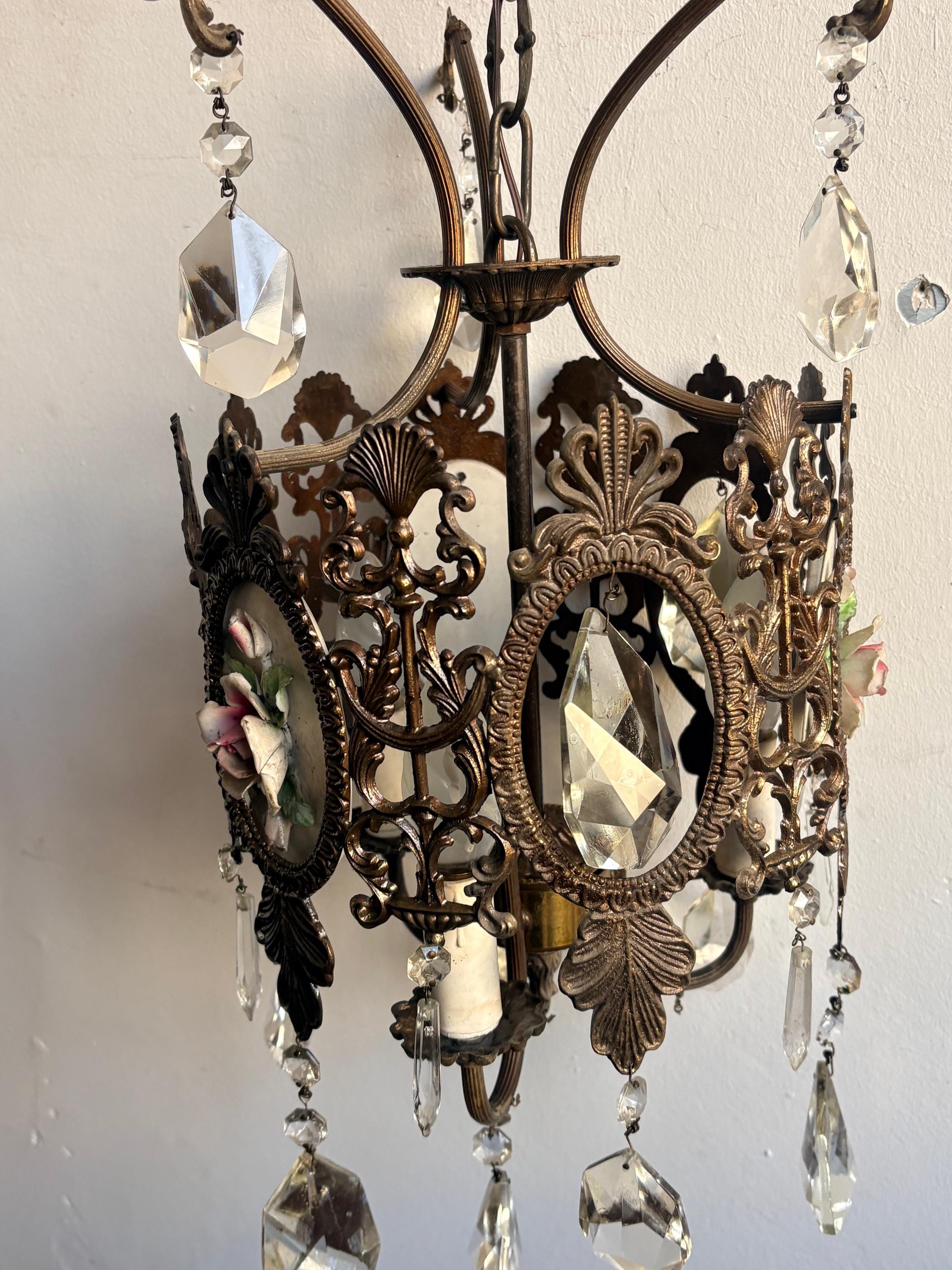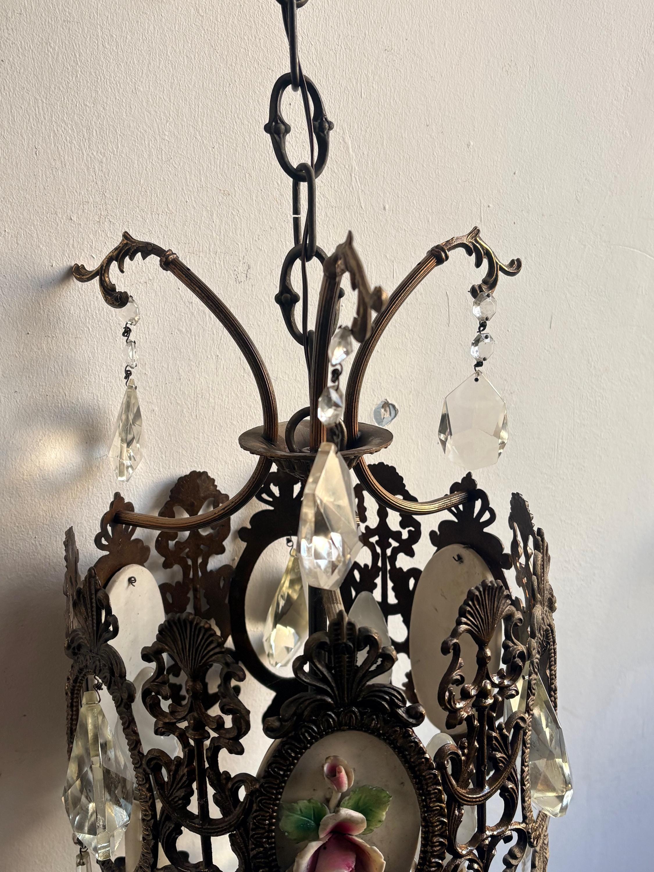 The pendant light is made of brass and features ceramic decoration with small roses. The entire chandelier is decorated with fine crystal drops. Three points light.