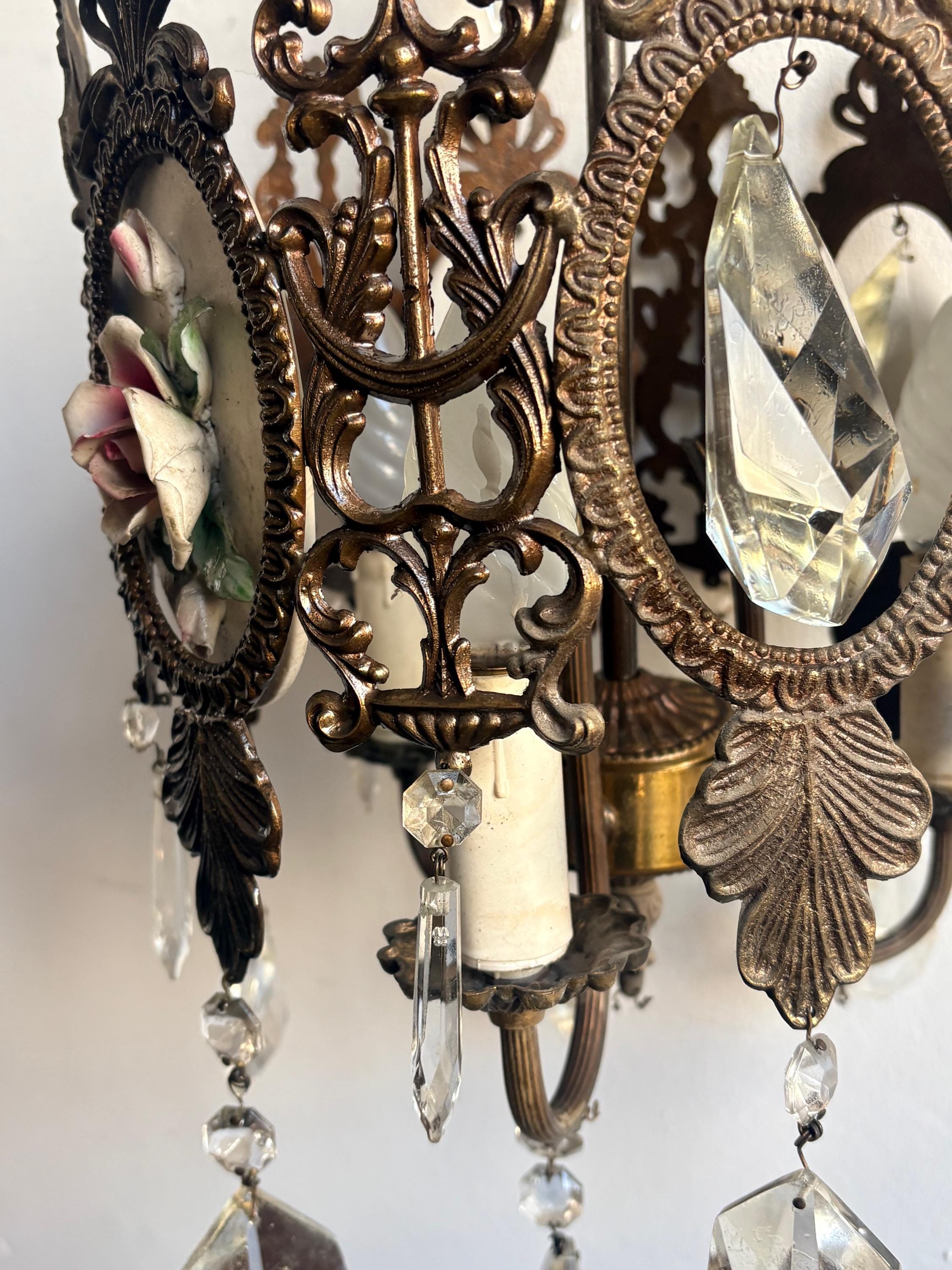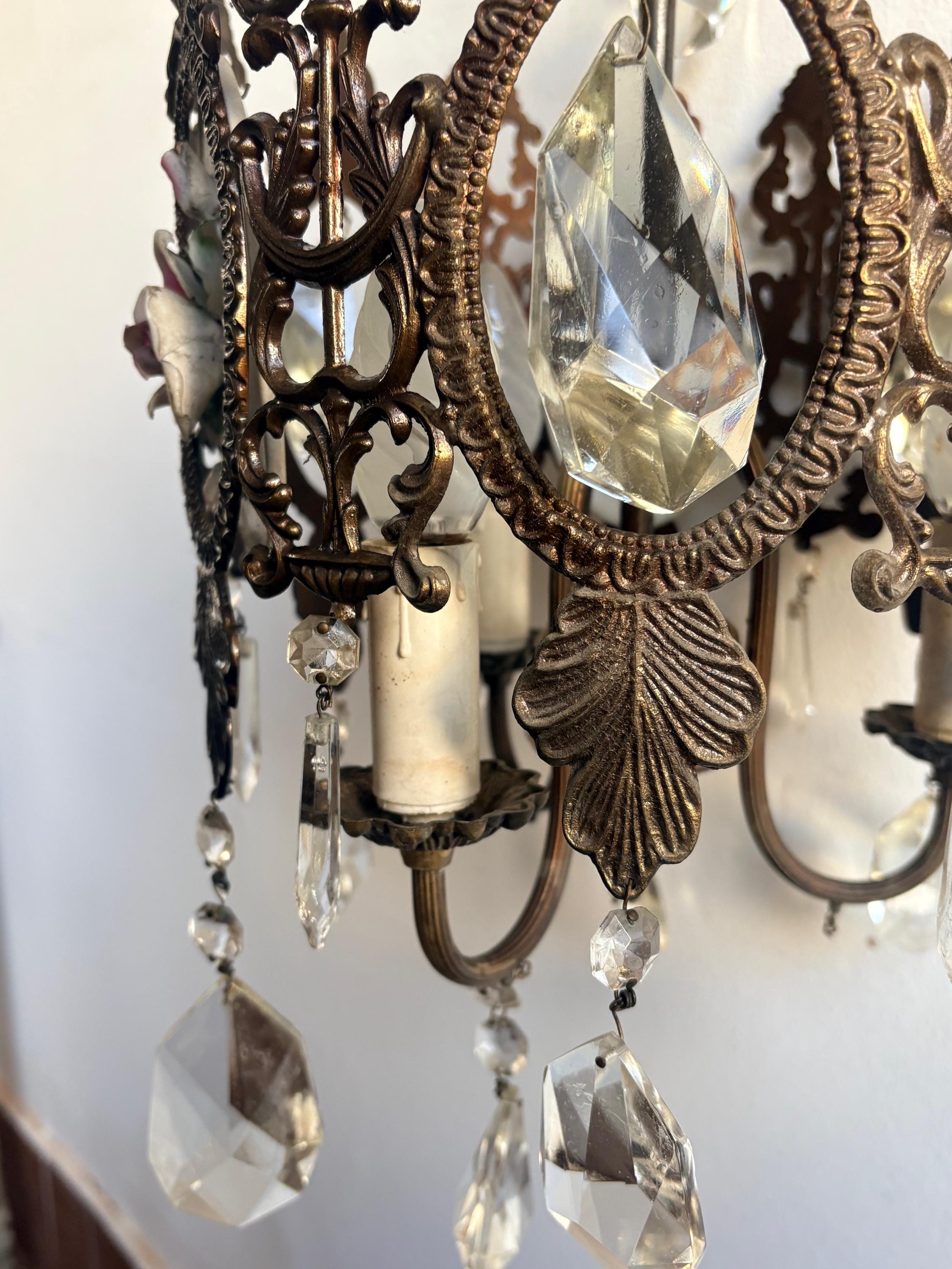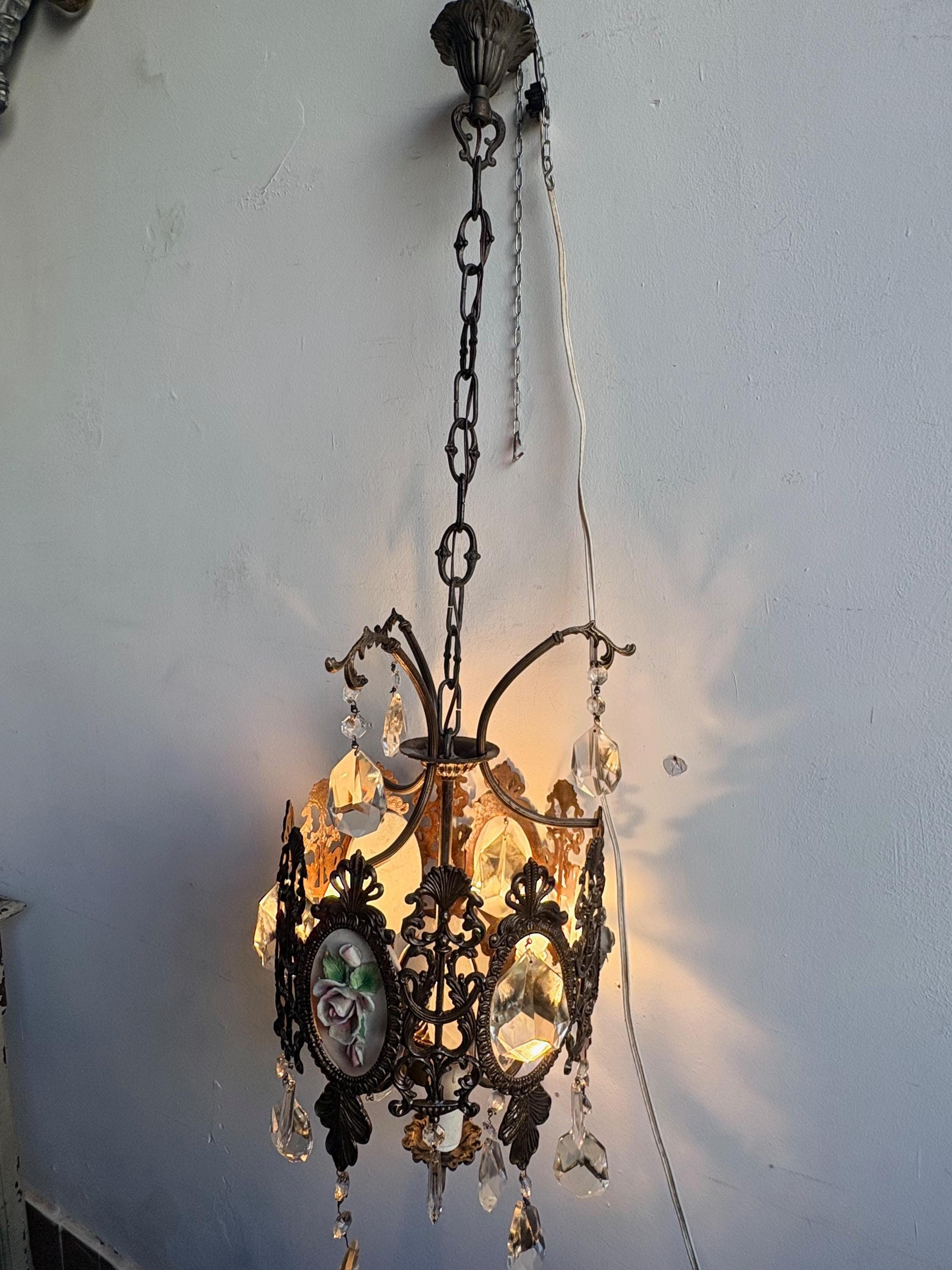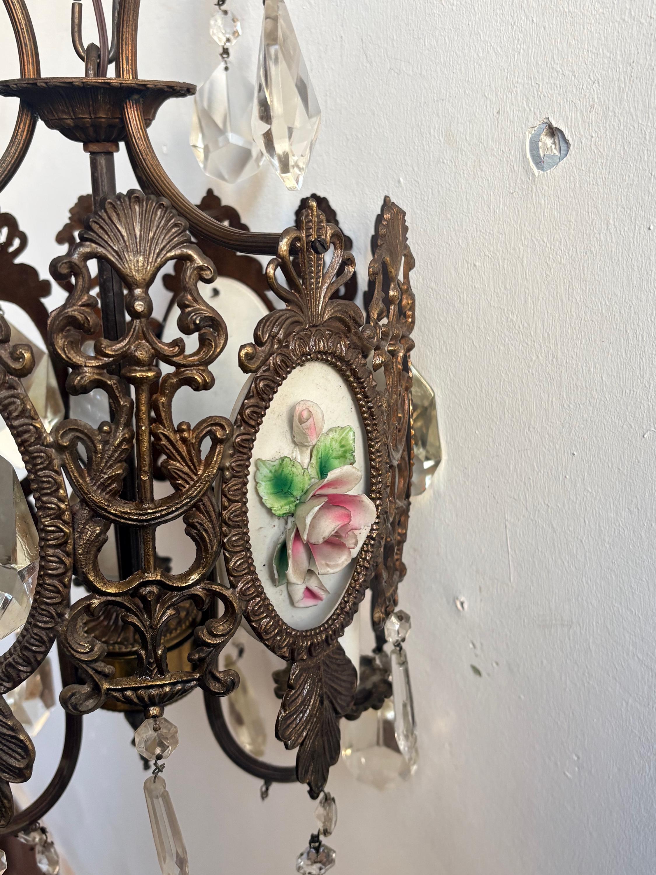 The pendant light is made of brass and features ceramic decoration with small roses. The entire chandelier is decorated with fine crystal drops. Three points light.